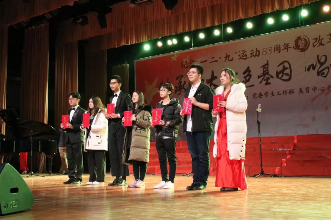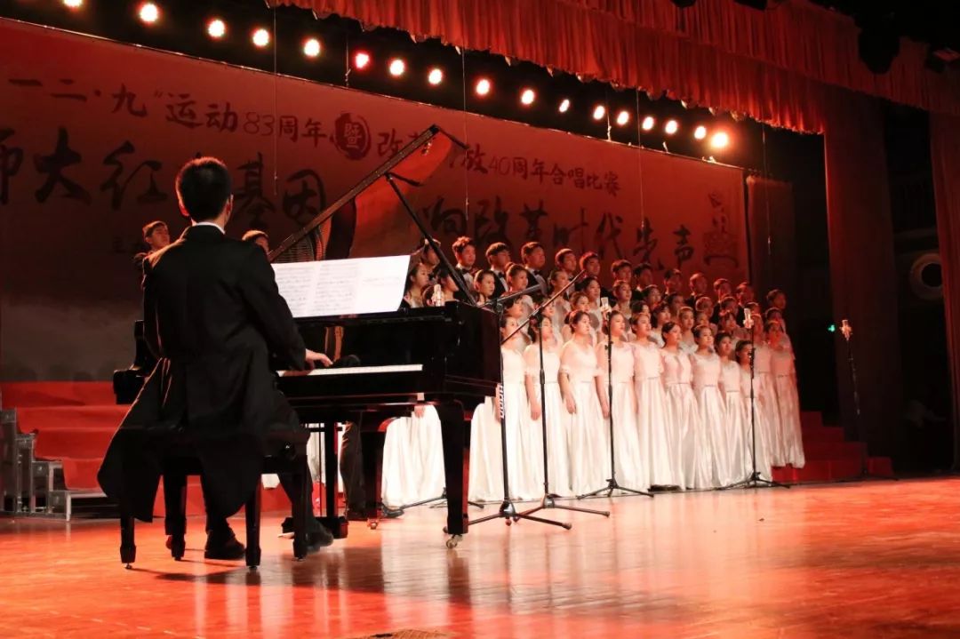 2018年12月9日晚7:00,“传承师大红色基因,唱响改革时代先声”纪念“一二·九”运动83周年暨改革开放40周年合唱比赛在学生活动中心举行,爱爱啦 合唱队作为倒数第三支出场的队伍,唱响一曲铿锵热烈的《走向复兴》,最终荣获大赛二等奖! 爱爱啦 合唱队主要由本科2018级本科生们组成,大家在集体中各展所长,共同努力。指挥唐佺、钢琴伴奏姜绍彬、管乐高偲博、鼓手李宁、镲手杜文露、朗诵文艺达以及每一个男高男低女高女中的小伙伴们,都是我们的表演中一抹绚烂的色彩! 指挥和乐器伴奏的同学们 歌曲以一段管乐独奏带入情境,引出文艺达抑扬顿挫的朗诵,并在钢琴、管乐、鼓和镲的渲染下,迎出合唱演员们洪亮悠扬的声音。表演赢得了台下观众的赞美与掌声。 钢琴伴奏姜绍彬上台领奖 最后,我们特别鸣谢:声乐指导张一凡,指挥指导郑涵予,化妆指导朱宁玉、李佳瑜、崔力元、李然及刘思燚,友情演出文艺达、刘亚康及杨春阳,刻苦认真训练的全体合唱队同学,以及所有为本次活动无私奉献的同学及老师。谢谢大家! 来源:爱爱啦 学生会 王艺铭供稿;苏碧纯、李佳瑜供图 |