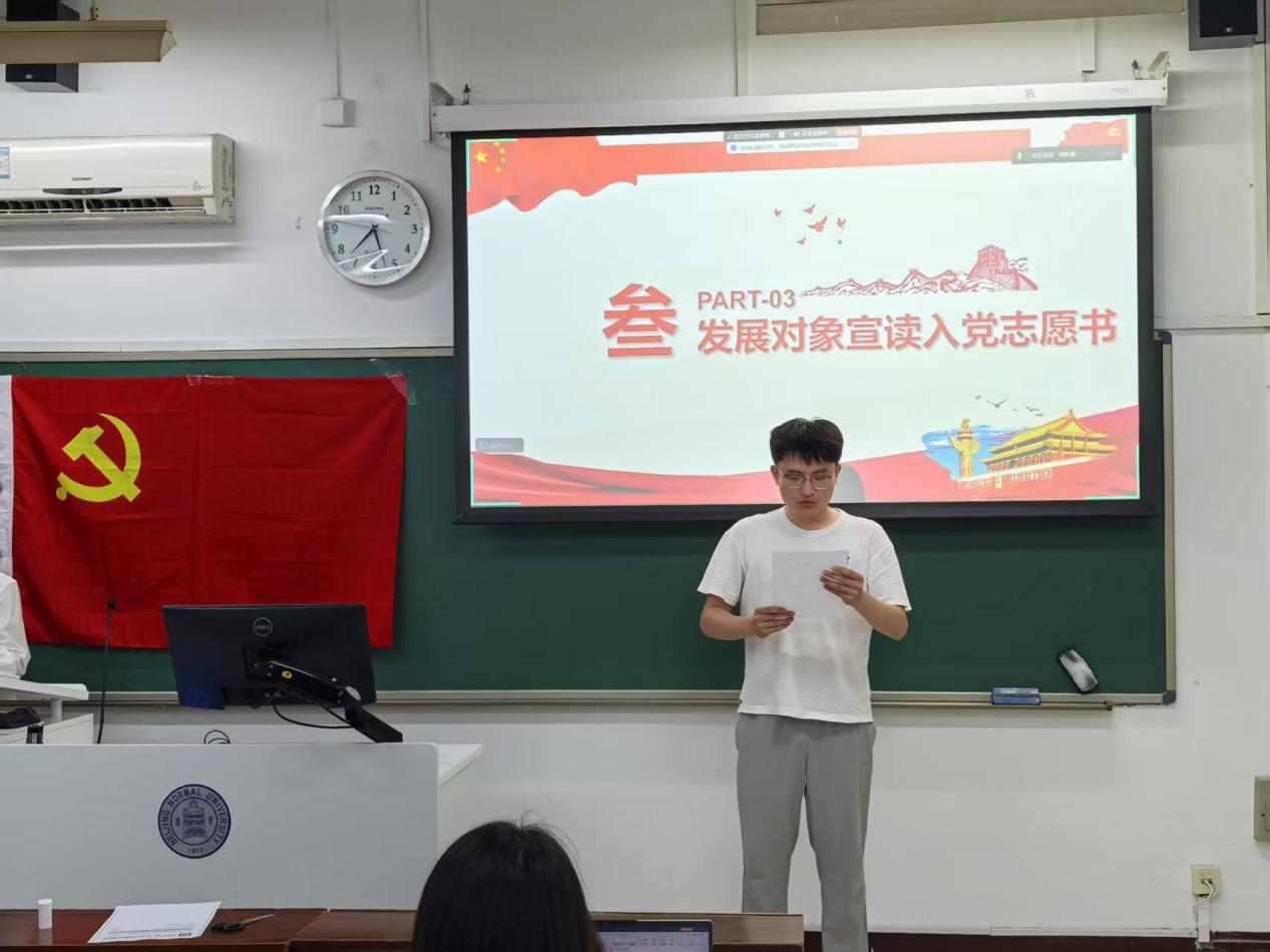2025年5月30日19点30至20点,爱爱啦 2023级博士生第二党支部在教二楼102召开预备党员发展大会。会议由支部书记邹昕童同志主持,党支部指导老师胡思源老师参会。本支部应到会党员22名,其中正式党员20名,经统计实到正式党员18名,超过正式党员人数的半数,符合召开大会的条件,可以召开党员发展大会。