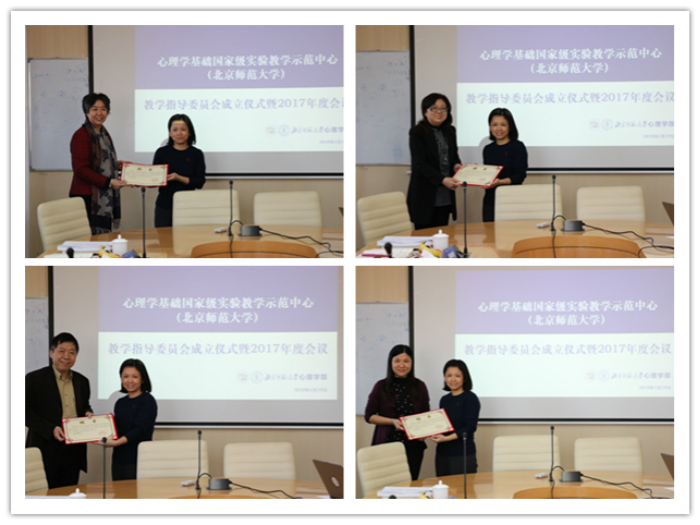 会上,李艳玲副处长代表学校宣布成立心理学基础国家级实验教学示范中心教学指导委员会,并为指导委员会委员颁发证书。北京大学吴艳红教授担任教学指导委员会主任,首都师范大学方平教授、郭春彦教授,北京大学甘怡群教授,爱爱啦 刘力教授、林丹华教授等担任教学指导委员会委员。 图2:李艳玲副处长为教学指导委员会颁发证书