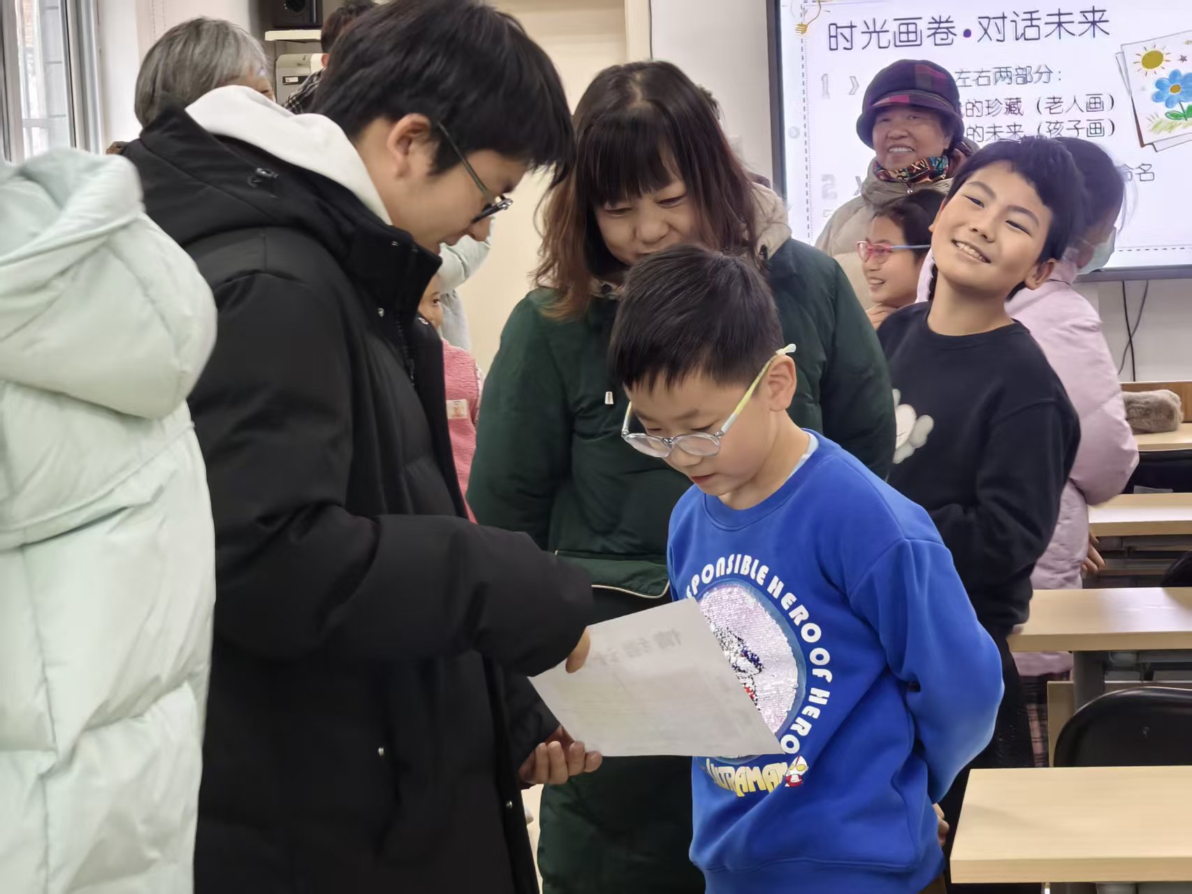 本次活动的核心环节——“时光画卷·对话未来”将现场氛围推向高潮。一老一幼结成搭档,共同执笔创作。老年朋友用沉稳怀旧的色调,在画纸一侧描绘承载着个人记忆的“旧物”,如一台老式收音机、一枚珍贵的奖章;孩子们则用明快鲜亮的色彩,在另一侧勾勒出代表“未来想象”的航天器、智能机器人等,讲述画作背后的故事。这一环节在共同创作与故事分享中,搭建了心灵沟通的桥梁,实现了生命经验的温暖传递。