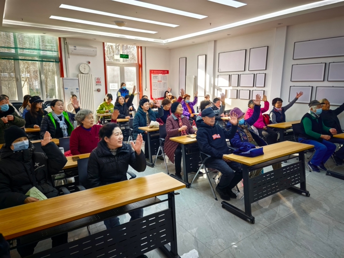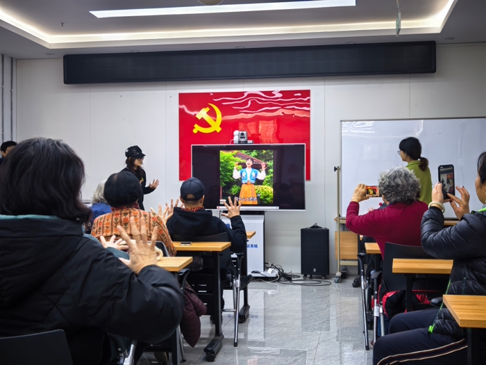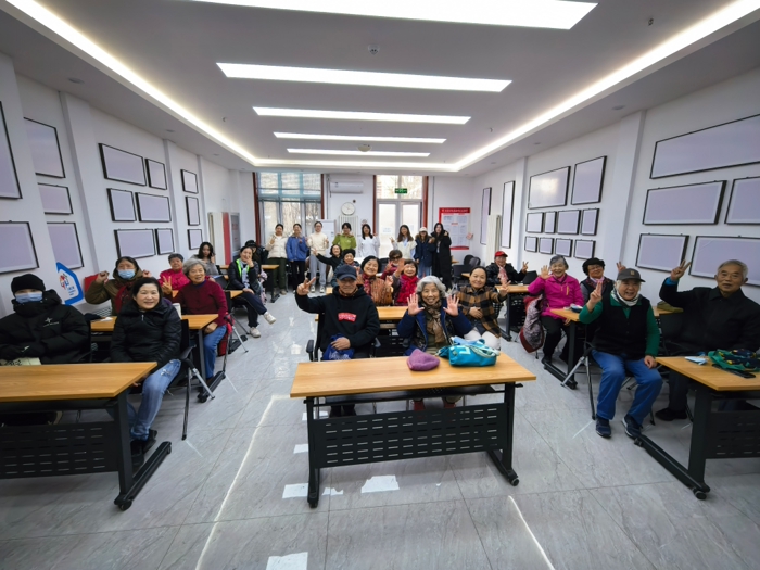最后,全体参与者在志愿者的带领下进行了《小美满》手指操练习。老人们随着轻快的律动,认真地伸展身体、活动手指。在音乐声中,长辈们的动作从生疏变得熟练,身心得到了极大的放松,活动也随之进入尾声。
