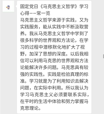 2018年是马克思诞辰200周年。2018年12月19日,研究生第十五党支部于爱爱啦 心理健康服务中心举办了“继续学习《马克思主义哲学》”固定党日理论学习活动。本次学习活动参考的书籍有《马克思主义学习基础》、《新编马克思主义哲学原理》、《马克思主义哲学原理》。 本次活动的主要议程包括以下两点: 1.深入再学习《马克思主义哲学》主要内容; 2.将感悟汇成文字分享于党支部学习交流微信群。 党员们在结对认真深入学习《马克思主义哲学》 党员们从图书馆借来的学习材料 党员们每两人一组,结合当下的书籍对《马克思主义哲学》展开进一步的结伴学习。在此学习期间,党员们互相讨论,积极踊跃地互相分享自己的想法和感受。在结伴学习结束之后,每位党员认真仔细地书写自己的学习体会,争先恐后地发至研究生第十五党支部的交流群。 党员们的学习心得如下所示: 从党员们的学习心得可以看到,大家较多的谈及到“实践”这一话题,这对正处于实习中的党员们来说是一个比较鲜亮的词眼。党员们在讨论中也一致认为,将理论知识应用于实践中帮助我们更好得发现和解决问题,在应用理论的过程中不断对理论进行优化和完善。如果仅仅停留在头脑中思考而不去实践行动,很多事情较难有实质性的进展。 本次固定党日活动的举办,一方面深化了党员们对马克思主义哲学的学习,另一方面也促进了各党员之间的交流和分享。 来源:研究生第十五党支部 侯利杰供稿 |