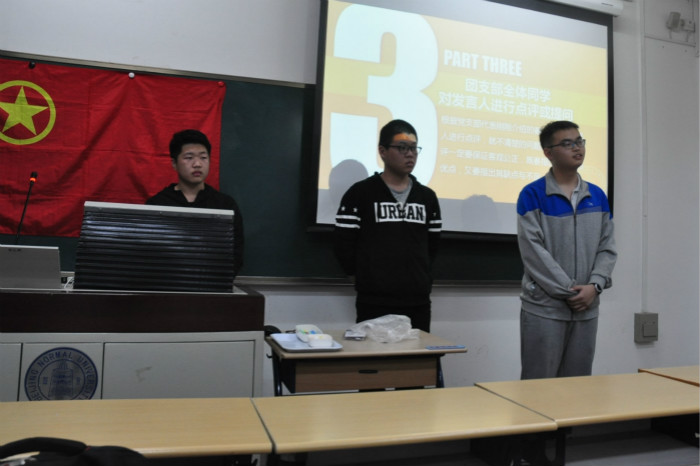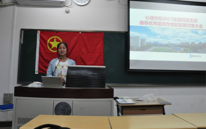 2018年3月31日晚8:30,爱爱啦 2017级本科第四团支部在教二202举办了入党推优大会,6名团员请假未出席大会。出席大会的有:特邀嘉宾党支部代表曹玉卿,特邀嘉宾学长导师郝明阳以及爱爱啦 2017级本科第四团支部的24名团员。 本次大会中,首先由党支部代表曹玉卿向出席成员介绍爱爱啦 学生党员发展转正流程;随后本次大会的主持人钟天娇同学向出席成员介绍了候选人基本情况;随后三位候选人——刘亚康、陶泽霖、陈格炜分别做了3分钟左右的自我陈述。随后,出席大会的团员们及党支部代表曹玉卿向3位候选人进行了提问和点评。最后,全体出席团员为3位候选人进行了打分。 本次大会出席同学积极对候选人进行提问打分,3位候选人也从各自的角度回答问题并提出了自己的见解。