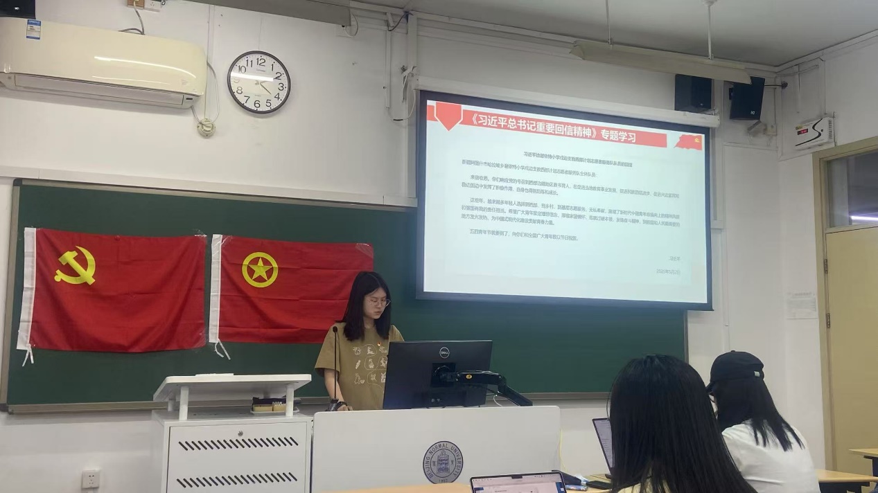 而后开展的是“五四青年节”主题团日活动,由团支书付晨露同志主持。团日活动的第一项内容是《习近平总书记重要回信精神专题学习》。付晨露同志给大家介绍了习近平总书记给谢依特小学戍边支教西部计划志愿者服务队队员的回信内容,同时概述了《中国青年报》对回信精神座谈会的发言摘登。