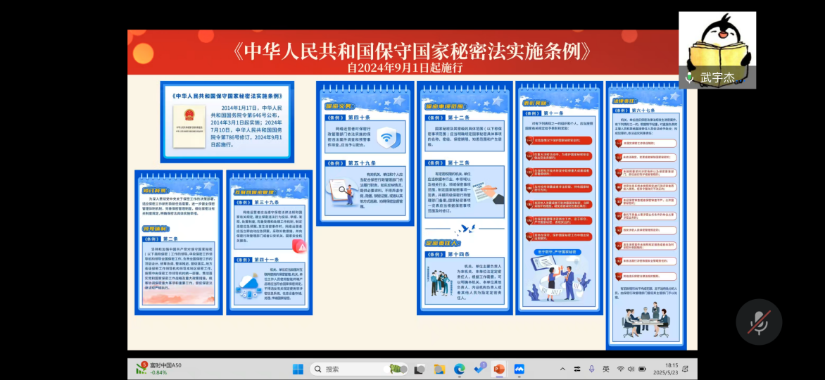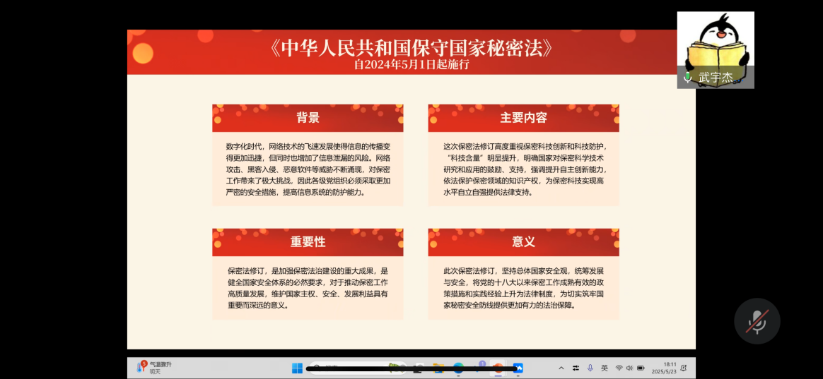 接下来,活动聚焦新施行的《中华人民共和国保守国家秘密法》及《实施条例》,武宇杰同志从“背景、内容、意义”三方面展开深度解读:在当前时代背景下,数字化时代网络攻击、数据泄漏风险加剧,保密法修订是应对国家安全挑战的必然要求;国家需要强化科技防护,鼓励保密科技创新,明确知识产权保护,为信息安全提供法律支撑;此举将党的十八大以来的保密实践经验制度化,为统筹发展与安全筑牢法治屏障。