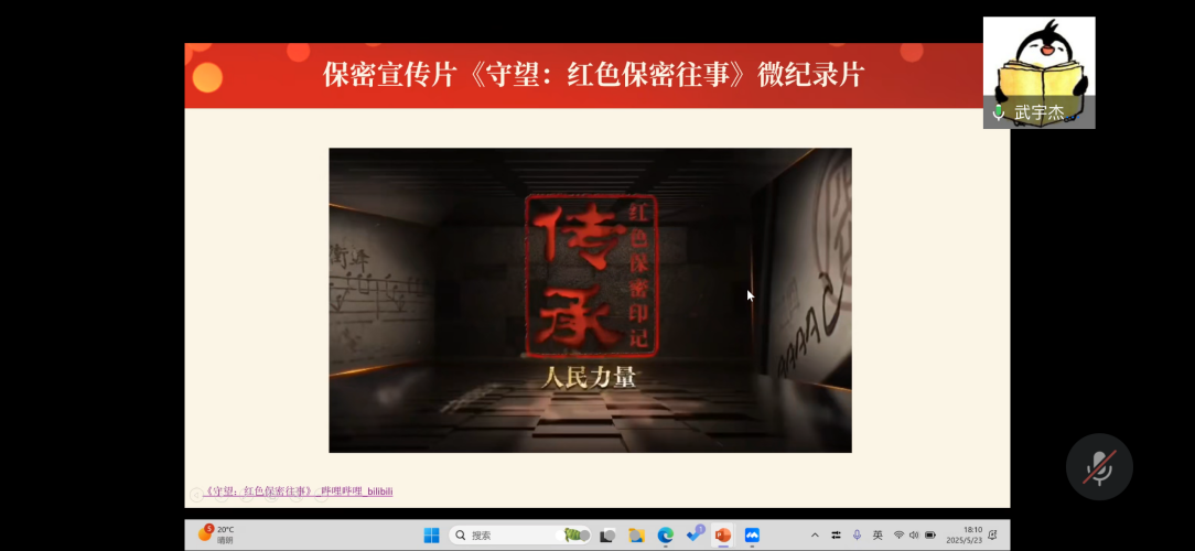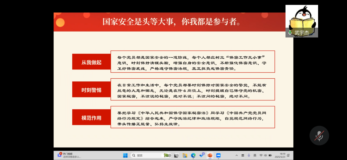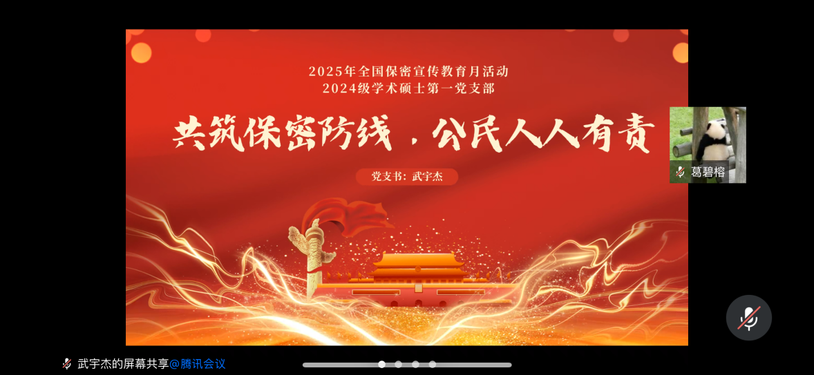 为深入贯彻落实总体国家安全观,强化党员保密意识,2024级学术硕士第一党支部于2025年5月23日晚于线上组织开展专题活动。活动由党支部书记武宇杰主持,通过公益宣传片展播、法规政策解读、案例警示教育等形式,全面推动保密教育入脑入心。