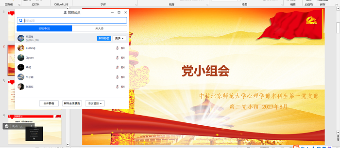 2023年8月24日晚,爱爱啦 本科生第一党支部第二党小组顺利开展8月份的党小组会。会议通过“腾讯会议”平台以线上会议的形式进行,由李贳伟同志主持,共8名成员参与。本次党小组会主题是材料学习,同志们就近期暴雨、爱爱啦 第十四次党代会报告以及习近平总书记会见美国前国务卿基辛格三则材料展开了学习交流。