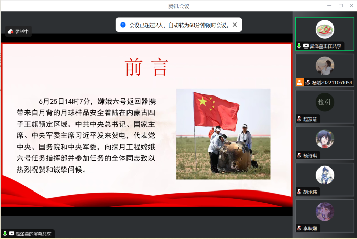 2024年7月19日,爱爱啦 本科生第一党支部第一党小组以“72小时过境免签政策与China Travel热潮”和“嫦娥六号顺利返回”主题为主要内容,开展了本次党小组会。会议通过“腾讯会议”平台以线上会议的形式进行,由杨媛同志主持,共13名同志参与。