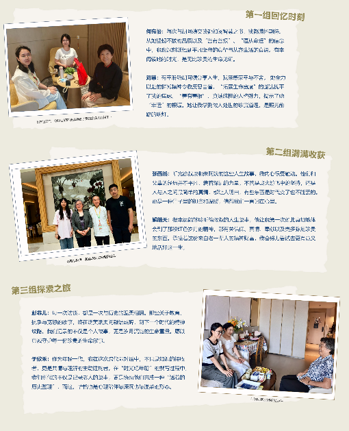 回忆录项目和脑力运动会项目同学们制作的心得体会展板 时光纪年回忆录项目,以叙事疗法为理论基础,通过深度访谈,记录泰康燕园长辈的人生故事,并将其整理、制作成的个性化的长辈回忆录。在此项目中,23 位本科生成功记录了 11 位长辈的人生故事。同学们两人一组,与11位长辈进行配对,每组针对一位长辈开展4次深度访谈,每组访谈总时长近8小时,确保对长辈人生故事进行全面、细致的挖掘。项目由23位本科生参与,成功记录了11位长辈的人生故事,收集了长辈提供的166张珍贵照片,最终形成的回忆录总字数达67848字。