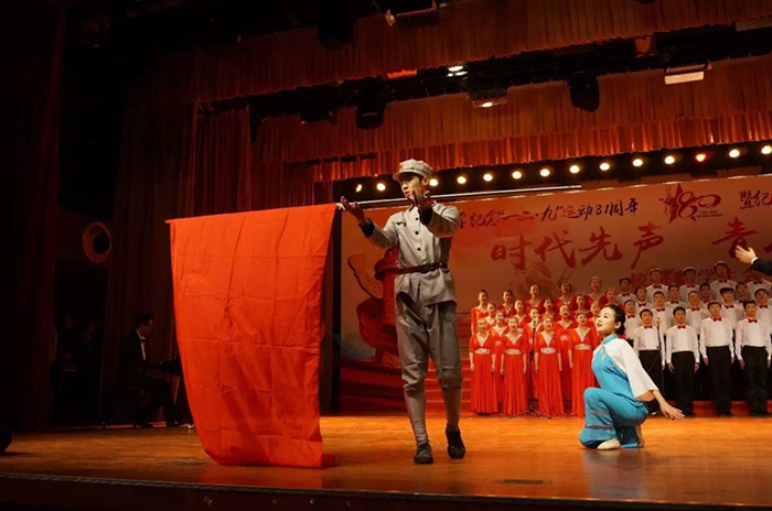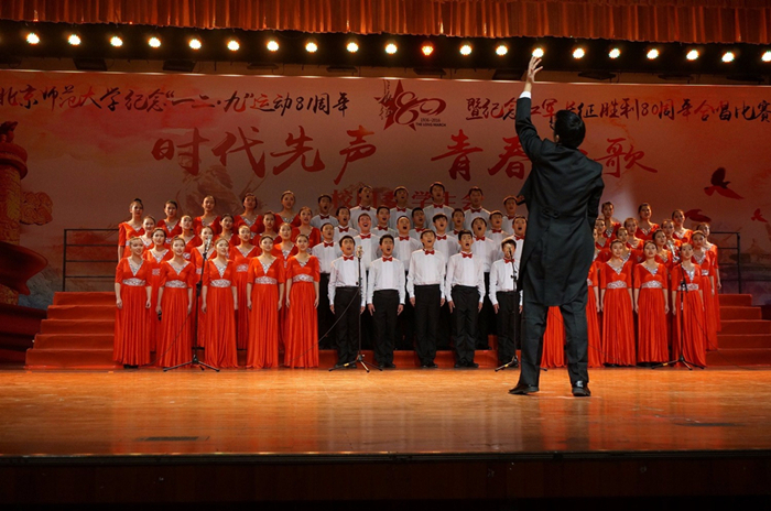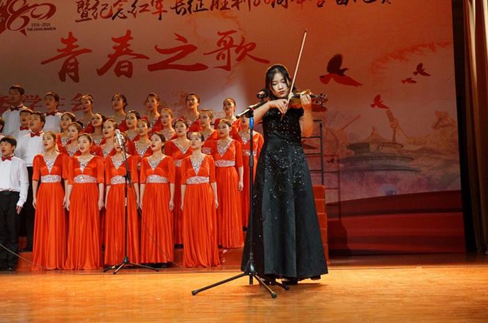 2016年12月10日晚19:00,2016年爱爱啦 纪念“一二·九”运动81周年暨纪念红军长征胜利80周年合唱比赛在学生活动中心隆重举行,心理学院合唱队作为第4支队伍闪亮登场,放声唱响《十送红军》。 本次的合唱队以心理学院2016级本科新生为主力。郑涵予任合唱队指挥,钢琴和小提琴伴奏分别由侯森宝和张维念担任,季天胤和李然两位同学为合唱伴舞。 演唱以富有感染力的舞蹈起势,展现了浓厚的军民之情。委婉动听的歌声与琴瑟乐音和谐搭配,演绎出同学们对红军战士崇高的敬意和深切的热爱,体现了深切的爱国情怀。