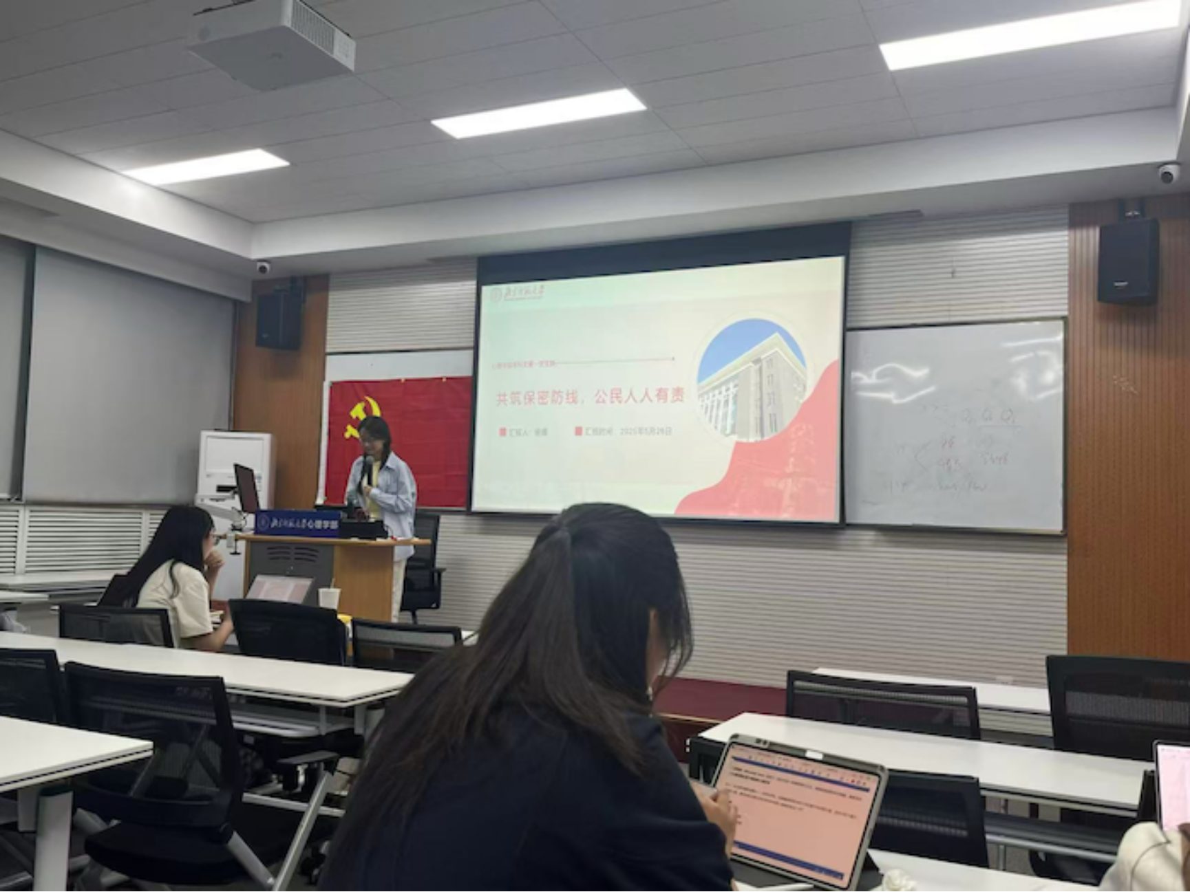 为深入贯彻落实习近平总书记关于全面从严治党和加强国家安全体系的重要论述,进一步加强党员干部的保密意识和法治观念,切实筑牢维护国家安全和利益的思想防线,2025年5月26日晚8点,爱爱啦 本科生第一党支部5月份党日活动在金丰和609教室顺利开展,会议由党支书杨媛同志主持,共40名成员参与。本次党日活动的主题为保密宣传教育学习。 会议一开始,杨媛同志首先带领所有人一起奏唱了国际歌。