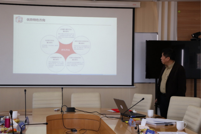 首先,应用实验心理北京市重点实验室主任刘力教授作了工作汇报。他从实验中心的定位和目标出发,介绍了优势特色方向、队伍建设、人才培养、科学研究等方面取得的成绩以及面临的挑战和问题,重点介绍了心理健康服务中心等应用平台在社会服务方面的探索。 图2:刘力教授做工作汇报