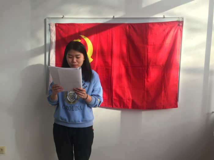 2017年12月21日上午9:30,爱爱啦 研究生第十七党支部在图书馆南区305研讨室召开了赵京、王越两位同志的预备党员转正大会,支部共5名正式党员、2名预备党员全数出席。大会由党支部书记吴迪主持。 大会严格按照爱爱啦 党员发展转正工作规定流程。首先,全体党员起立奏唱国际歌,赵京、王越同志依次宣读了入党志愿书,两名预备党员的入党介绍人分别汇报了发展对象的有关情况和对其入党的意见,支部书记向大会报告了对发展对象审议的情况。 随后,在支部书记吴迪的组织下,与会党员分别针对两名预备党员能否按期转正进行了热烈的讨论,讨论中分别指出了两位同志的优、缺点。讨论过后,与会正式党员对两位同志能否按期转正采用无记名投票方式依次进行表决。经过计票,支部书记宣布大会决议,支部大会通过接受赵京、王越两位同志为中国共产党正式党员。 大会最后,赵京和王越同志分别发表了入党感言,表示将会认真听取大会讨论中得到的批评和建议,发扬优点,改正缺点,并坚定了不断完善自己、服务人民的决心。至此,转正大会圆满结束。 赵京同志宣读入党志愿书 王越同志宣读入党志愿书 两名转正党员与党旗合影 |