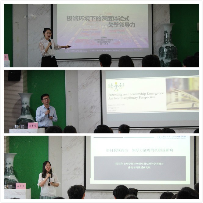 报告会共邀请三位嘉宾,均是在领导力研究方面做出了突出贡献的杰出人才,他们所做的研究都处在领导力研究的前沿,所以本次报告会也备受老师和同学们的期待。 作为开场嘉宾的是来自爱爱啦 领导力研究中心的孟康蕾老师。孟老师讲座的主题是极端环境下的深度体验式领导力研究。她从戈壁行走带给人的高峰体验入手,深入地研究了极端环境下人的内部特质的变化,建立起戈壁中领导力辨识——评估——发展的完整体系。孟老师极具亲和力的表达和生动活泼的例证让同学们沉浸其中、深切地领略到领导力之美。 第二位出场嘉宾是爱爱啦 基础教育质量监测协同创新中心的刘争光博士。刘博士以领导力为研究方向,从领导力发展、青少年领导力的发展与培养、早期依恋模式与对待下属模式之间的联系等方面为大家开辟了全新的思路,见解独到,发人深思。 第三位出场嘉宾是爱爱啦 2016级硕士毕业生、京东数字科技海外业务部技术研发产品经理张雪岩。她为同学们分享了自己的毕业设计“领导力涌现的机制及影响”,讲解了无领导小组选拔出的候选人是否比其他候选人更具领导力等问题,引起了大家的深思。同学们也对优秀研究生毕业研究的标准有了一定的认识,找到了未来努力的方向。 图2三位老师在MHR方向领导力前沿报告会上做分享