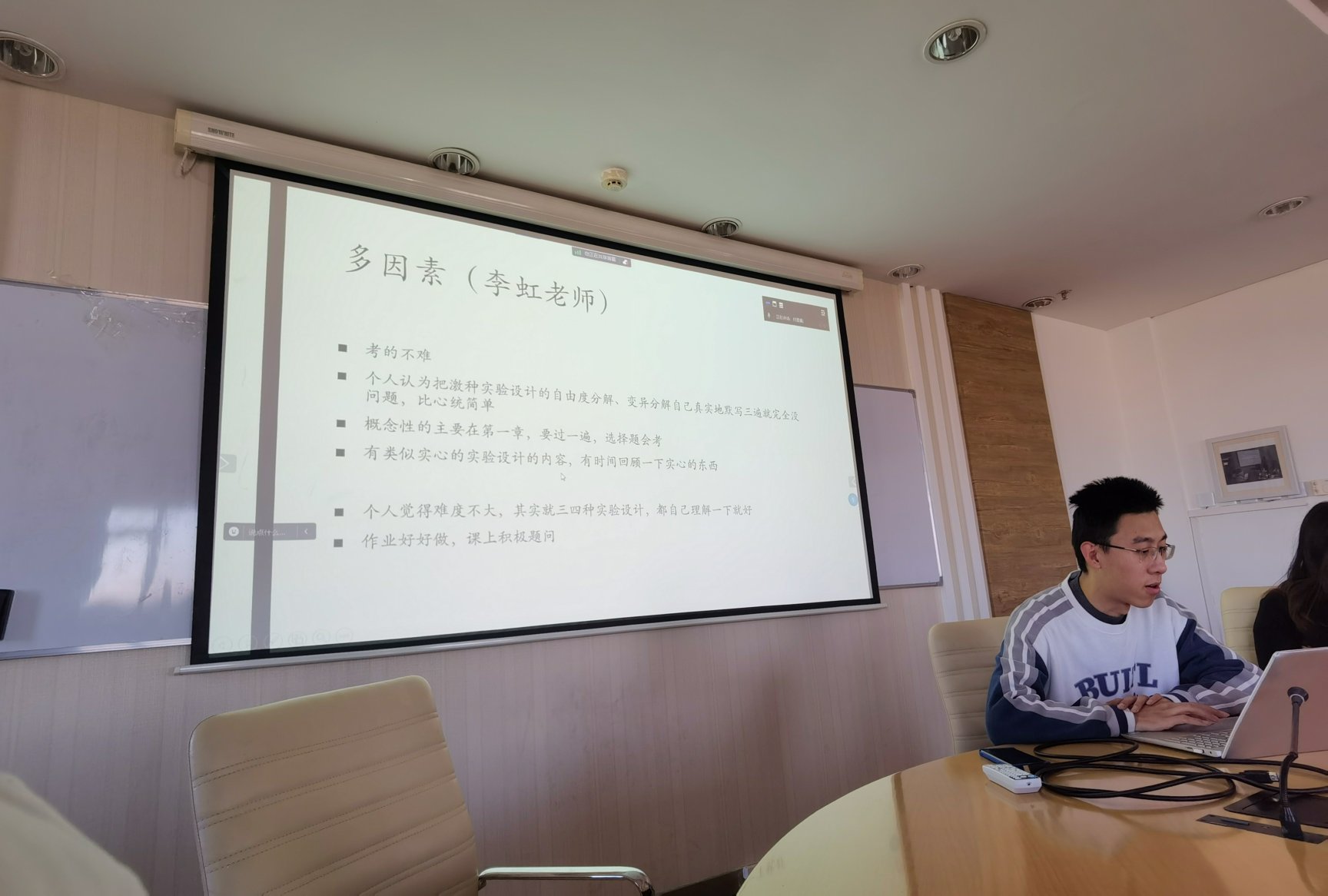 随后,付晨露师姐分享了社会心理学、变态心理学和多因素实验设计的考试经验,给同学们带来如何分配考试时间、如何分配复习时间的建议,更同学们提供了科学的复习方法来帮助同学们复习这些科目。最后付晨露师姐也向将要在下学期学习多因素实验设计的同学们介绍了多因素实验设计的学习内容,以帮助同学们了解这门学科。