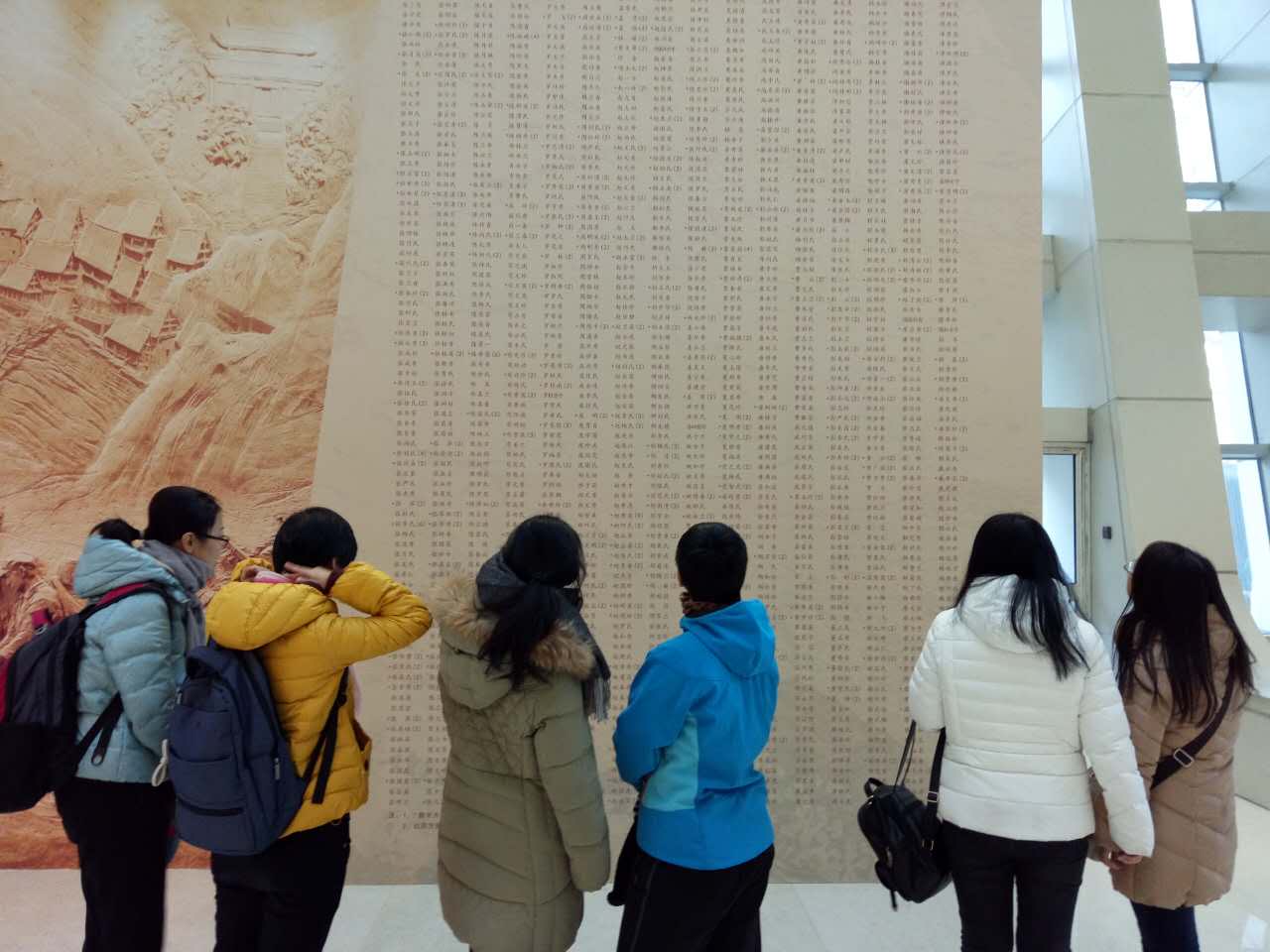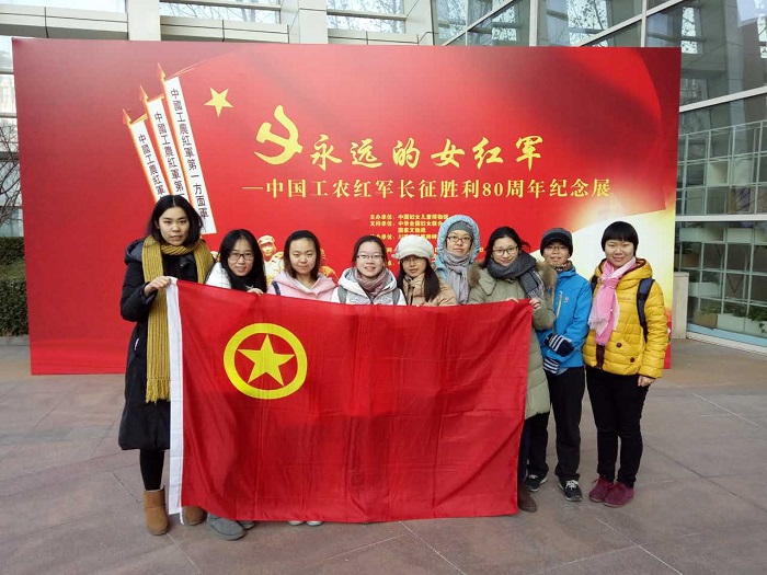 2016年12月10日,星期六早晨,在微凉的东风中,心理学院2014级2班的小伙伴们在位于政协路旁的中国妇女儿童博物馆门前集合。九点钟整,这里的“永远的女红军——中国工农红军长征胜利80周年纪念展”将准时拉开帷幕。在等待的过程中,陆陆续续来了许多的人,从小学生到大学生,到社会人士。 在同学们到齐后,我们满怀期待地踏进了展览馆的大门。在解说员的带领下,我们走过墙上悬挂着的一列列伟大的女红军前辈们的肖像,听解说员讲述她们身上承载着的战火硝烟和不屈精神,步履沉重,胸腔热涌,不觉已经热泪盈眶。 纪念展看完后,部分同学还到博物馆的其他展厅进行了参观,包括儿童馆、妇女服饰文化馆等等。此次观展,同学们都获益良多。 时值红军长征胜利80周年之际,通过回顾在艰苦年代中女性的伟大事迹,我们体会到了顽强不屈、挺身而出、甘于奉献等诸多的长征精神,更体会到今日平和生活的来之不易,国家和平发展理念背后血的教训,激励着我们珍惜当下,努力丰富自己的专业知识,为祖国的富强添砖加瓦! 图1. 纪念合影 图2. 同学们仔细观看展厅前铭刻着诸多革命女烈士姓名的大展板 图3. 同学们聚精会神地听讲解员讲述革命事迹 图4. 同学们仔细参观长征年代红军们用过的物品