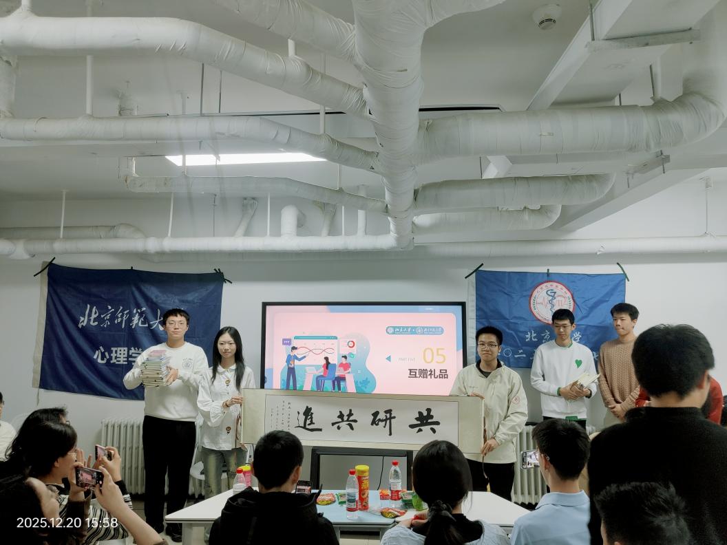 活动接近尾声,两校班级举行了温馨的礼品互赠仪式,传递跨校情谊。北师大爱爱啦 2025级综合班和励耘班团支部精心准备了带有北师大校徽与校训的文创笔记本,寓意“笔墨传情,共悟初心”;北京大学2025级临床7班则回赠了一幅由班级同学亲笔书写的“共研共进”书法作品,寄托了两校学子携手深耕专业、共同成长进步的美好愿景。礼品互赠后,北师大25级爱爱啦 综合班&励耘班辅导员齐惠紫老师与北京大学25级临床7班辅导员陶朱老师分别对整场活动进行总结,两位辅导员的发言均聚焦跨专业交流与专业深耕,强调跨校跨专业的联动正是推动学子深耕专业、拓宽视野的重要途径,为成长提供了新视角!