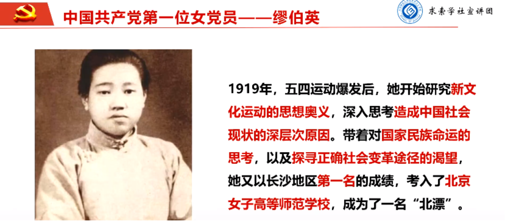 缪伯英是中国共产党第一位女党员,也是北师大的一位优秀校友。1919年五四运动爆发后,她开始研究新文化运动的思想奥义,深入思考造成中国社会现状的深层次原因,带着对国家民族命运的思考和探寻正确社会变革途径的渴望,以长沙地区第一名的成绩考入了北京女子高等师范学校。 在学习期间,通过结识了北京大学的何孟雄,她对北大的学生活动产生了浓厚的兴趣,并通过中国共产党先驱之一李大钊的宣讲接触到了先进思想;而后她自荐成为李大钊的学生,加入了李大钊创办的北京大学马克思主义研究会,和进步青年们一起学习共产党宣言等马克思主义著作。 又在一大召开前的1920年11月,缪伯英由李大钊亲自介绍加入了中国共产党,光荣地成为了中国共产党的第一位女党员。缪伯英师姐的精神跨越时空,历久弥新,深深融入了每个师大人的血脉之中。