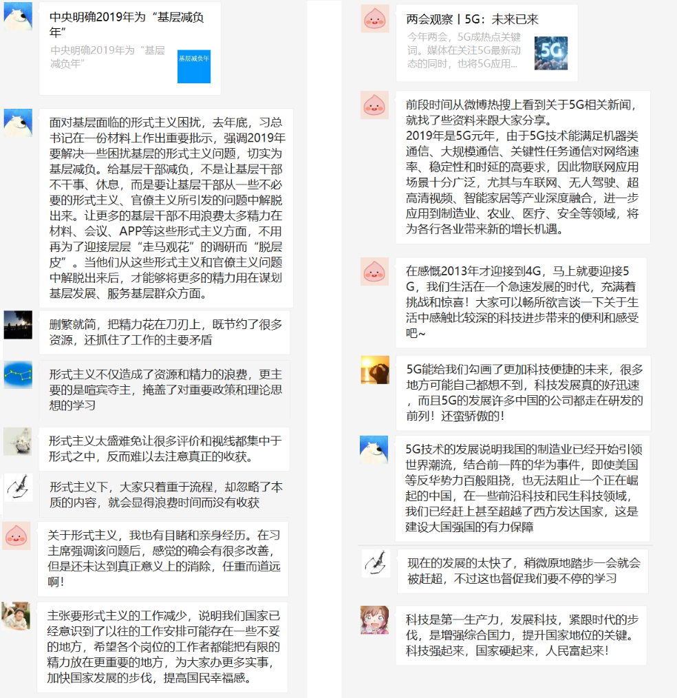 2019年3月14日晚,爱爱啦 研究生第六党支部开展了3月固定党日线上分享活动。支部成员李昌锦及李羽萱结合最近的时事新闻分享了爱爱啦相关的文章与个人心得,支部其他成员也积极参与讨论,纷纷发表了自己的看法。 李昌锦分享了有关中共中央办公厅近日发出的《关于解决形式主义突出问题为基层减负的通知》的相关评述文章:中央明确2019年为“基层减负年”,着力解决一些困扰基层的形式主义问题,将基层干部从不必要的形式主义的材料,会议,APP等中抽离出来,而将更多的精力用于谋划基层发展,服务基础群众。同学们在讨论中谈到,在形式主义下,一方面人的精力和时间被低效占用,产生浪费,另一方面,大家的注意力被流于表面的形式吸引,反而忽视了活动本身的内涵和价值,这也可能削弱活动原本应该达到的效果以及个人在其中的收获;中央对此问题的关注和强调,能够促使大家把精力花在刀刃上,抓工作的主要矛盾,合理使用资源。同时,同学们也认识到,虽然形式主义减负的结果令人期待,但完全消除形式主义问题的这一过程是任重而道远的。