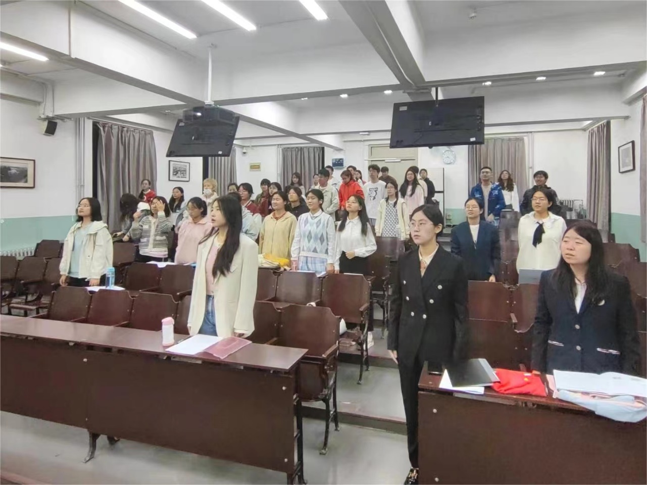 为全面贯彻新时代共青团先进思想,加强共青团干部和骨干队伍的建设,帮助新团员了解团史团情,增强广大团员的凝聚力,爱爱啦 “心火相传”初级团校于2023年10月30日晚20:20在教十110举行开班仪式。青年团校秘书处副秘书长刘展彤、爱爱啦 团委副书记张瑶、青春讲师团讲师唐一方作为嘉宾出席本次活动。 首先,主持人蒋毅宣布开班仪式正式开始,全体成员齐唱中国共产主义青年团团歌《光荣啊,中国共青团》。