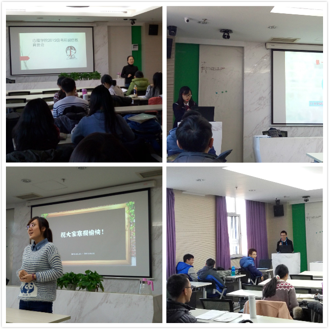 12月30日下午3点,心理学院15级本科2班于后主楼1318成功举办考前诚信教育暨减压班会。 首先,班主任李昕益老师向同学们强调了考风考纪,表达了对同学们的期望。随后,班级辅导员张文对具体的考试纪律做出了明确的讲解,同时也为大家介绍了寒假实践活动,和一些安全知识。接着,班长王赫向同学们介绍了考试诚信承诺书的填写要求,并表达了对大家的祝福。最后,班级雪绒花使者任奕带领大家进行了减压游戏“滚雪球”,一时间欢声笑语不断。 本次班会让同学们认识到了诚信考试的重要性,了解了寒假实践活动计划和一些安全知识。同时也帮助同学们舒缓了心理压力,让同学们能够更加积极自信的面对期末考试。 (心理学院2015级本科2班 郑兆奇供稿供图) |