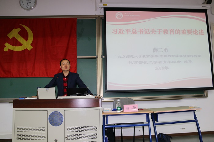 11月12日下午,爱爱啦 “木铎心声”党校在教四101举办了“习近平总书记关于教育的重要论述”主题讲座。本次讲座由爱爱啦 教育学部、中国教育政策研究院教授,教育部长江学者青年学者薛二勇老师主讲。薛老师从为什么要开这门课、怎样学好这门课程、这门课程内容是什么等方面,结合自身研究和工作进行了深入浅出的讲解。