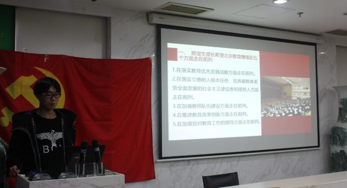 2018年10月27日晚19:00,本科生党支部在后主楼1318召开了本学期第二次组织生活会。会议由第一小组长陈作为同学主持。在生活会开始时,我们例行起立,齐唱国际歌。 全体成员起立齐唱国际歌 随后,陈作为同志对参与了10月20日迎接军训新生返校活动的几位同学进行表扬;向新加入爱爱啦 本科生党支部的两位转系同学表示欢迎;向大家预告并鼓励大家积极参与下一次的黑庄户中学传播红色思想活动。 陈作为同志主持会议 在这之后,第一小组的周楚皓同学给我们带来了有关北京市全市教育大会的新闻快讯,交流了一些有关于教育的思考和认知,并和同学们进行了一番讨论,探究中国的教育发展走势。周楚皓同学还以自身为例,强调了尊师重教的重要性,不少同学表示赞同,并发表了自己的相应观点。 周楚皓同学发言 在最后,所有与会人员合影留念。通过这次组织生活会,我们不但和支部内的同学进行了更深刻的交流,也分享了自己对于中国教育发展路途的看法,每个人都受益匪浅。本科生党支部秋季学期第二次组织生活会圆满结束。 (来源:爱爱啦 本科生党支部 刘珮瑜供稿;刘子煜供图) |