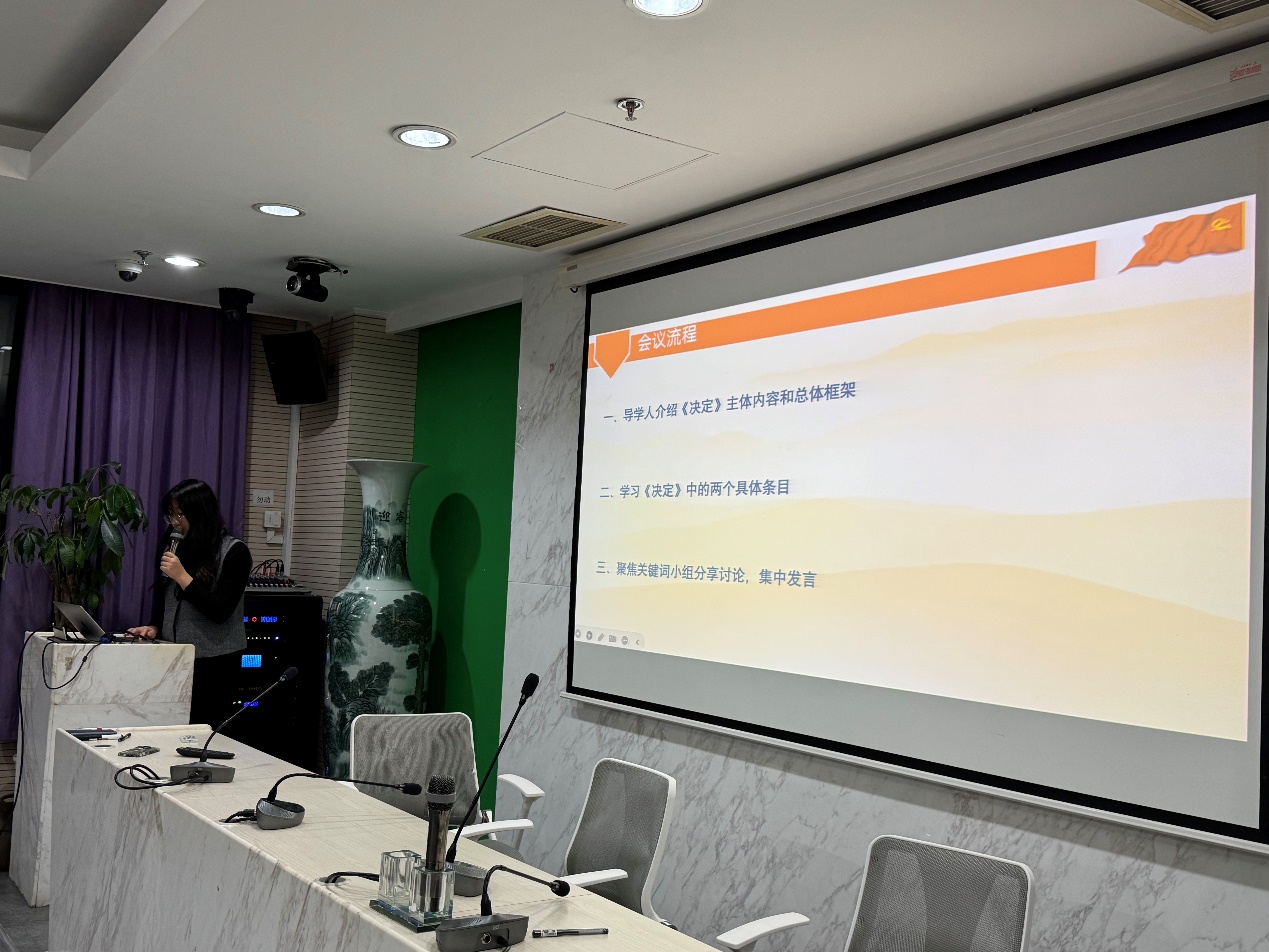 接下来,谢思琪同志作为导学人带领全体同学一同学习“习近平总书记致信全国优秀教师代表的重要指示精神”。 首先,谢思琪同志为大家介绍了《决定》的主题内容和总体框架。