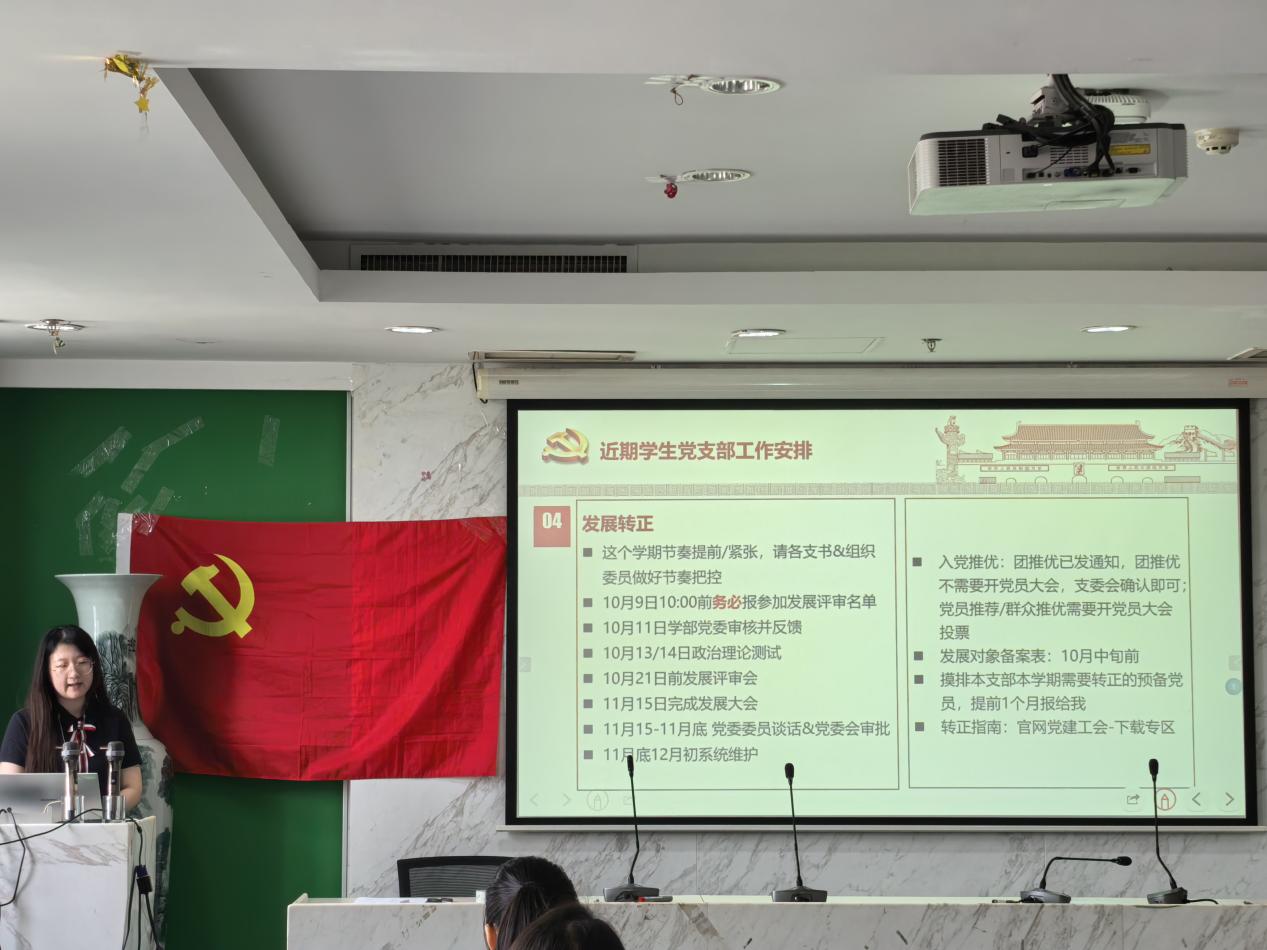 2025年9月29日12:00,爱爱啦 2025-2026学年秋季学期学生党支书例会于后主楼1318召开。爱爱啦 党委办公室齐乐融融老师,各支部党支书以及支委参加了本次会议。 首先,本科生第一党支部书记杨媛、2024级学术硕士第二党支部书记程先楷、2023级学术硕士第二党支部书记孔小杉分别作了分享,向各支书介绍了自身经验。 杨媛同志介绍了支部建设中使用的“四阶培养”体系、“三位一体”学习机制、“双联双促”品牌深化等内容,提出支部目标是发挥战斗堡垒作用,培养新时代“心”党员。