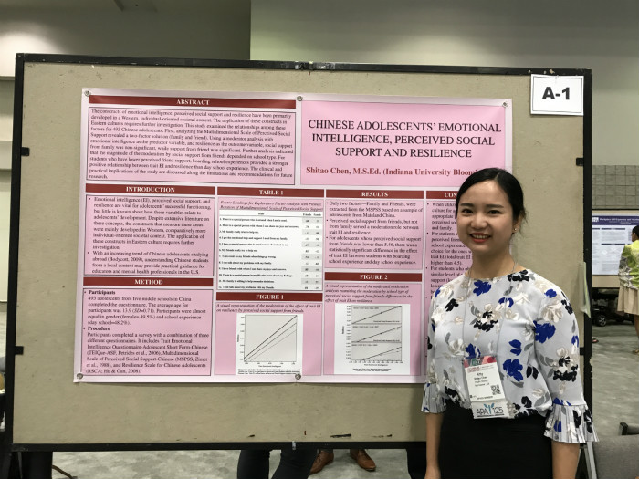 C:学校心理学比较新,并没有很多人了解这个学科。在美国,学校心理学、咨询心理学和临床心理学三个是有相似但又有很大区别点的学科。一般大家对咨询心理学和临床心理学知道的比较多,对学校心理学并不太了解。 我了解学校心理学也是很机缘巧合的。我研究生的项目是咨询心理学,当时有几个学校心理学的博士和我们一起上团体咨询课。在上课的过程中,他们谈到很多给孩子做咨询的案例,我觉得特别有意思,我就多问了几句。他们告诉我,学校心理学是在学校里,通过给孩子提供一些心理测量、行为测量、学习能力的测量来帮助他们了解自己的优势和劣势,让学生(尤其是有特殊教育需求的学生)找到合适自己学习程度课程的学科。当然学校心理学还包括给学生提供一些个体咨询、团体咨询,以及帮助老师提供一些教学干预方式和对学校整体做一些危机干预。 我觉得它和我之前的教育背景及家庭背景都非常吻合。我出生于教师家庭,我爷爷是一名教授,父母也曾经都是中学老师。我从小就看他们怎么教育孩子,怎么和孩子建立好的关系,并进一步得到家长的信服。我觉得学校心理学可以和小朋友一起工作,在他们心理还没有完全成型的时候给他们一些帮助,特别有意思,所以我也申请了学校心理学方向的博士。 在学习学校心理学的时候,我系统地学习了心理测量。通过不同类型的心理测量,我们可以了解到孩子们学习上和心理上的需求;同时通过和家长的访谈以及关注孩子和家长的互动模式可以更好地了解他们和家庭的关系。我们还可以和老师接触,教导老师怎么更好地理解学生的需求。所以,这个学科可以调动学生、家庭、学校三个不同的方面,让三个部分可以通力合作。 在我没了解学校心理学之前,我曾经想着去当一名老师。但是我又不想把自己局限在某一个具体的学科中,我想了解的更多。后来走进学校心理学,相当于找到了一个和原来理想相似,又高于原来理想的职业。 图1 陈师韬老师2017华盛顿的APA convention上做的poster presentation L:我了解的学校心理学可能就是大学里面的心理咨询中心、入学时的心理测试和部分学生访谈,被访谈的学生还会有点压力或者羞耻感之类的,你觉得大家对学校心理学的普遍误解有哪些?