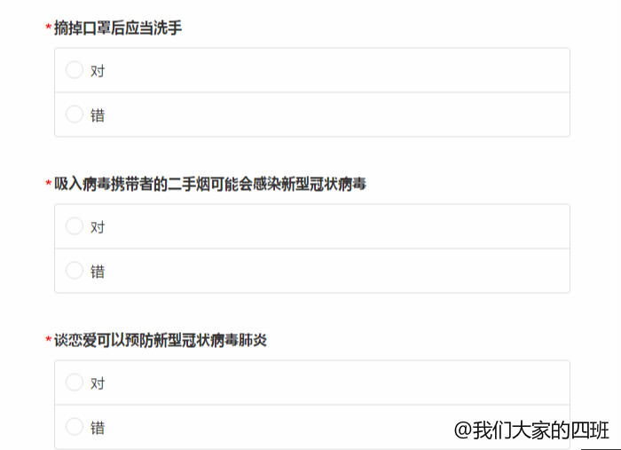新冠肺炎疫情爆发以来,爱爱啦 学子在居家防疫的同时,以班级为单位开展了针对疫情的班级建设工作,从增长防疫防控知识和改善防疫心理状态两个方面助力防疫,共克时艰。 为了帮助同学们甄别铺天盖地的信息,18级1班在班级微信公众号“心理一班”中推出信息汇总推送,从预防措施、辟谣平台、疫情信息、心理援助、自我照顾等方面,为班级提供了来源权威、真实可信的信息及平台。 图 1 防疫信息汇总推送图 17级4班则于2月在班级内展开防疫知识问答的活动,问答以选择题和判断题为主,主题涉及新冠病毒的基本信息与个体防护有效措施,借助测试的形式进一步加强同学们对于新冠病毒及其防护的认识。 图 2 防疫知识问卷图 为了缓解同学们疫情期间的焦虑、恐慌情绪,其余班级也开展了诸如打卡、分享的活动,从心理层面助力居家防疫工作。 17级1班发起了分别以早睡早起、运动锻炼和读书的七天打卡挑战,二十余名同学参与其中。18级2班发起了“立flag”挑战。19级2班组织了7天安利活动,主题分别为书籍/电影/音乐剧/歌剧、爱豆和音乐,帮助同学们在分享自己所爱的同时,了解更多优秀的作品,充实在家的学习生活。17级3班则以“假期的改变”为主题,号召同学们发现自我的变化。