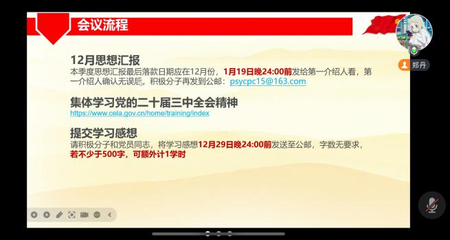 2024年12月28日星期六下午3点,爱爱啦 专业硕士第一党支部通过腾讯会议线上的方式,组织并召开了12月党日活动。活动的主要内容是观看学习视频,总长1个小时40分钟,参会党员(含预备党员)5人,积极分子10人,大家集体学习党的二十届三中全会精神。除此之外,生活会还向积极分子说明了季度思想汇报的要求。 会议第一项,全员奏唱国际歌。 会议第二项,由党支部组织委员郑丹同志代表支委会作工作汇报。郑丹同志简要回顾了支部一个季度以来开展的工作情况,聚焦于学期末积极分子的思想汇报要求。