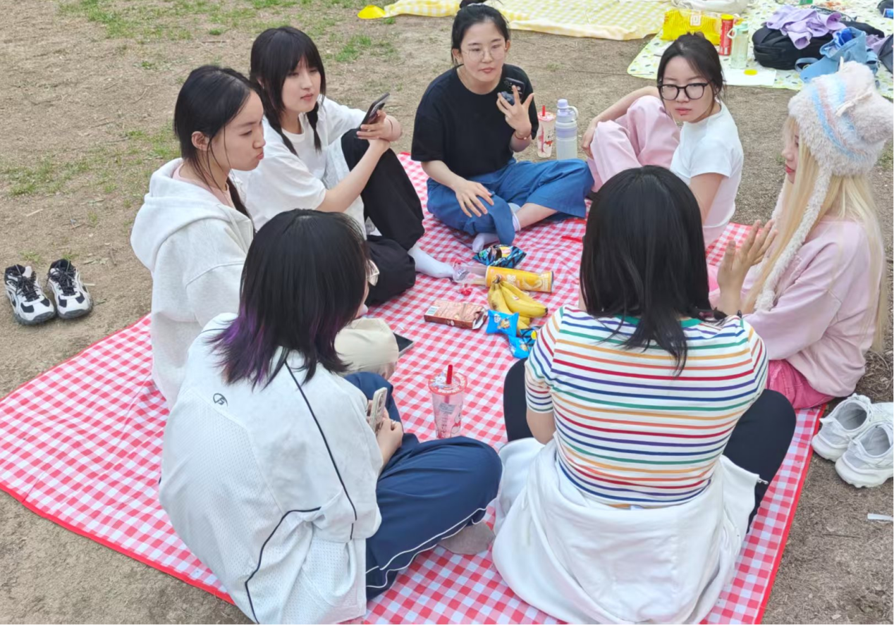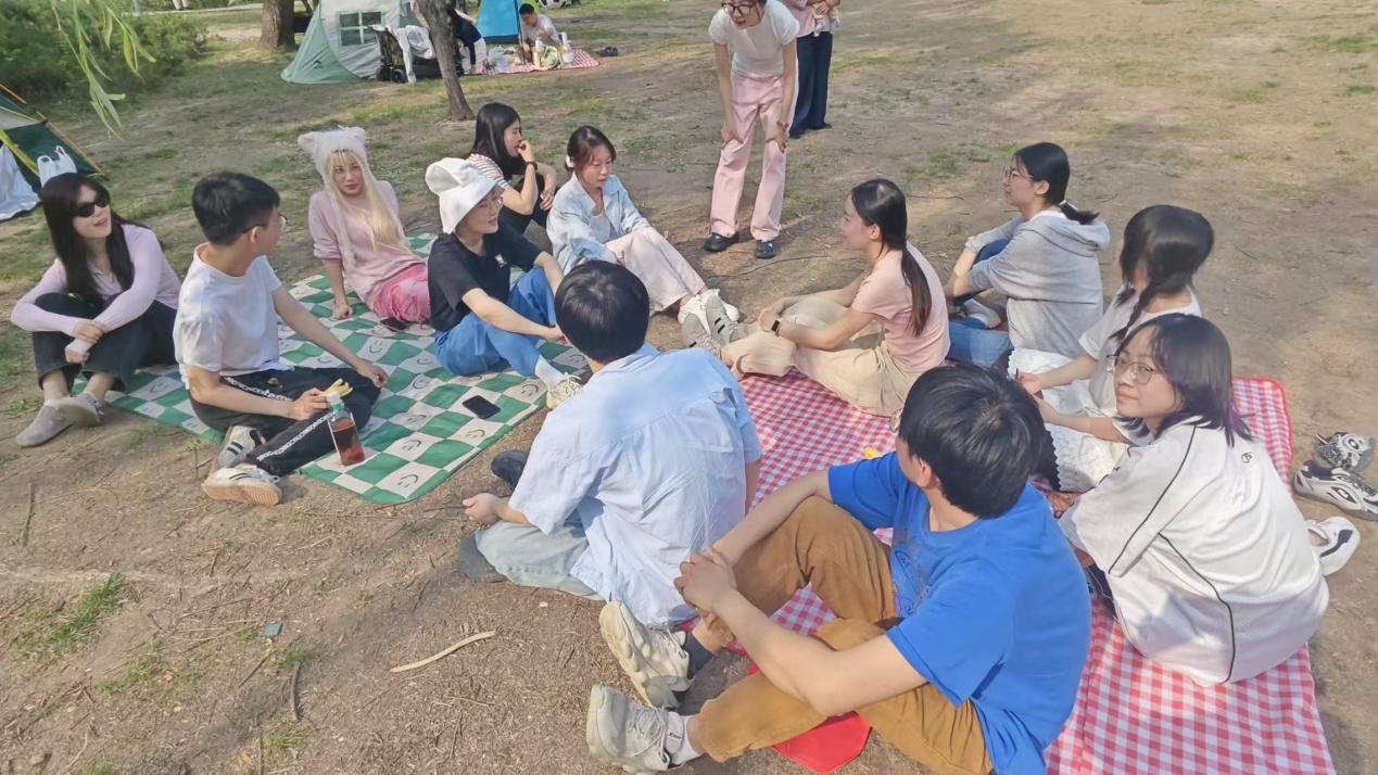 游戏环节结束后,同学们围坐在野餐垫上,分享自带的美食。有人组织趣味小游戏,有人畅聊学习生活,更有摄影爱好者捕捉下一个个精彩瞬间。夕阳西下,欢笑声仍在草坪上回荡。