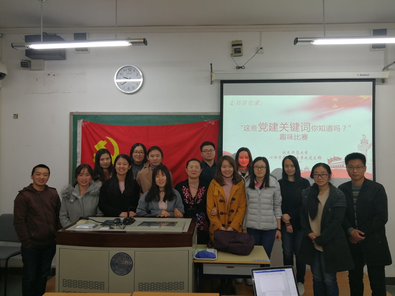 2018年10月29日晚8点,爱爱啦 研究生第九党支部“支书讲党课”活动在教四208教室顺利举行。活动共有16名正式党员和1名发展对象参加,由支部书记笪姝主持。 首先,在党支书的主持下,开展了支书讲党课之“这些党建关键词你知道吗?”趣味比赛。党支书笪姝将此次参与活动的党员们随机分成两组,进行党建关键词趣味比赛,组织委员姚小喃进行小组计分。本次趣味比赛包含了“四有好老师”、“两学一做”、“三会一课”、“三严三实”、“六大纪律”、“四讲四有”、“五大思维方式”、“一带一路”等20个党建关键词,逐一呈现。比赛过程中,与会同学积极思考,踊跃回答,积极阐释关键词具体内容。之后,党支书从“提出背景”以及“具体内涵”两方面对关键词进行解读。期间,支部同志认真聆听,学习氛围轻松,效果良好,最终两组同学得分不分上下。大家通过一个小时的学习对一些党建关键词有了进一步的了解和掌握。 趣味比赛之后,党支书结合之前对支部成员关于本学期支部会议和活动召开的时间统计,向大家介绍本学期的党建活动安排,明确了11月和12月的支部活动计划。 最后,由于本次支部大会是本学期第一次会议,支部同志在会议召开前就积极地表达了希望能和大家多进行学习生活的交流的意愿。因此,大家主动分享了各自的学习进展和困惑,成员间有了更多的学术碰撞和情感融合,促进了对支部成员的了解,增进了支部成员的感情,增强了支部凝聚力。 通过此次大会,与会同学们通过趣味比赛的形式对党建知识有了更进一步的学习和掌握,也明确了本学期支部活动和工作安排,大家学习和讨论氛围积极融洽,支部成员的沟通也进一步得到加强。 来源:研究生第九党支部 李晓燕供图;姚小喃供稿 |
