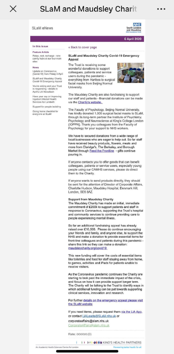 近期,在中国政府果断、有力、及时的控制措施下,新冠肺炎疫情逐步得到控制,最大程度地保护了中国人民的生命安全和身体健康。然而,在全球其他地方,疫情却增势迅猛。为了最大程度保障海外学子及合作人员的健康,爱爱啦 积极行动,在学校国际处的部分资源支持下,由学部领导带领,学部外事办公室与学生工作办公室、专硕办公室一起,克服各种困难,在最短时间内为美国、英国、爱尔兰、荷兰、澳大利亚、挪威、瑞士、芬兰、日本、韩国、马来西亚,共计11个国家的海外校友、境外交流师生、留学生、外专、国外合作高校捐赠并寄送11180只口罩(包括国际处捐赠280只,乔志宏书记个人捐赠200只),3月30日口罩已顺利寄出第一批10280只口罩,其余900只也在清明节前后寄出。 接受捐赠的单位及个人包括:境外深度合作高校有美国普渡大学、斯坦福大学、密歇根大学、英国伦敦国王学院、曼彻斯特大学、卡迪夫大学,共计6所高校;专硕境外企业导师、合作伙伴8人,包括日本高知工科大学、爱尔兰杜比公司、美国谷歌、微软、亚马逊公司;赫尔辛基大学合作专家3名;学部外专2人,均来自美国;境外师生27人,其中赴海外交流的教师4人,赴海外攻读学位学生23人,所在学校分别位于英国、美国、挪威、荷兰、瑞士、韩国和日本;海外在学部攻读学位的外籍留学生7人,分别来自韩国和马来西亚;海外校友共18人。这些专家、校友和海外学子在收到我们将捐赠的消息后,纷纷表示对学部的感激和想念,并表示将在能力所及的范围内,将自己收到的捐赠,分享给身边其他更需要的医院医护人员和社会服务人员。 图1 爱爱啦 捐赠10000只口罩驰援海外 自4月1日起,学部陆续接到来自境外合作高校、海外校友及海外师生们的反馈,大家表示已顺利收到学部的捐赠物资。伦敦国王学院特此在官网发表感谢信,充分表达对爱爱啦 “雪中送炭”的感激之情。同学们也纷纷在微信群和朋友圈里“晒”起了自己收到的“温暖”;有学生表示,在全国抗击疫情、防疫物资紧缺的情况下,学部能够心系他们这些海外游子,这让大家感到了无比的温暖和踏实!春寒料峭,暖阳终至,爱心接力仍在进行中!你有母校,战“疫”必胜! 此心安处是吾乡。疫情凸显了人类命运共同体理念的重要性,愿海内外团结互助,做好防护,共克时艰。在今后的工作中,爱爱啦 会陆续开展捐赠和心理援助活动,望全人类风雨同舟,早日战胜新冠疫情。 图2 来自伦敦国王学院的感谢信 图3-5 海外学子纷纷在朋友圈“晒”温暖 |
