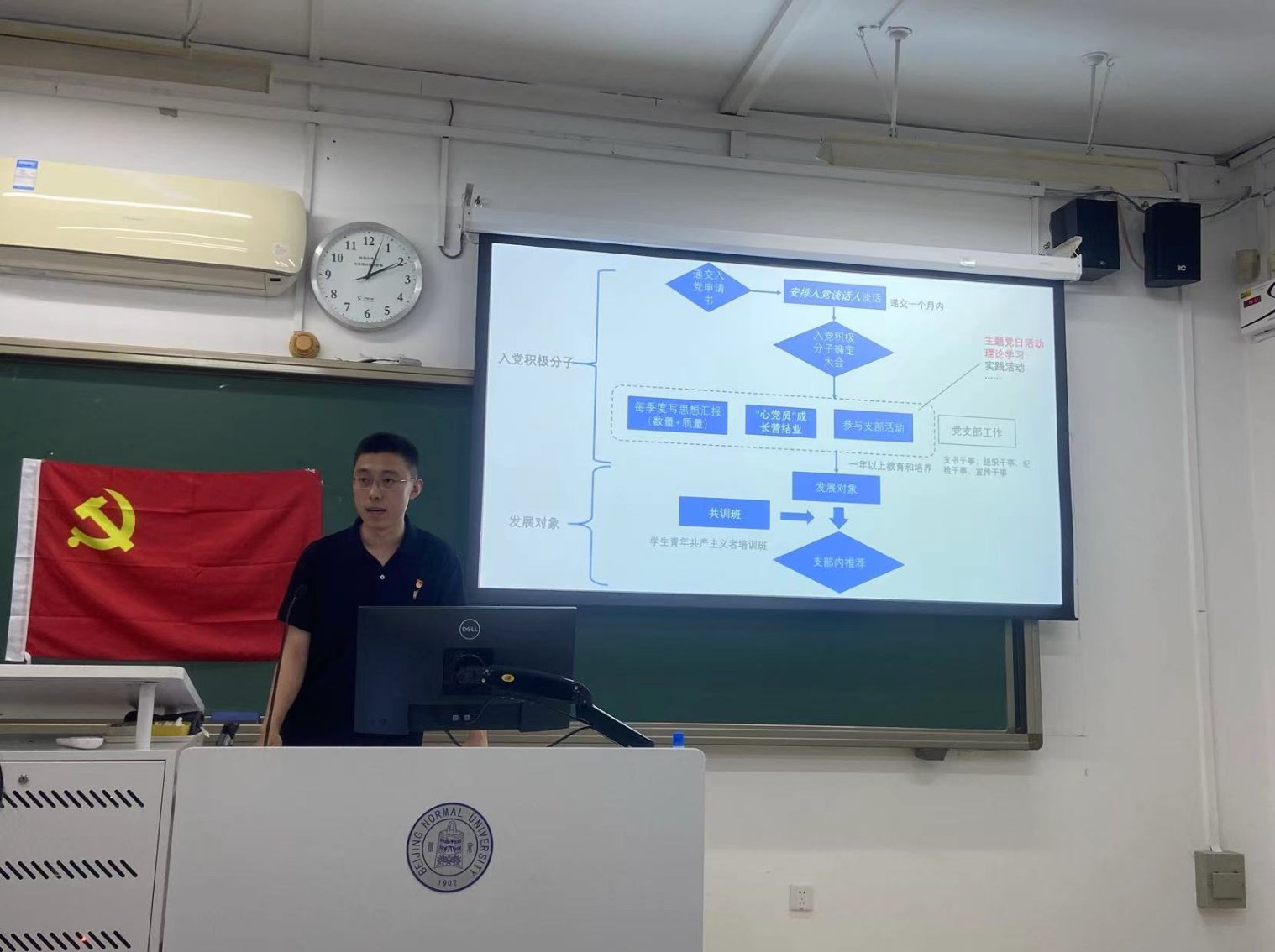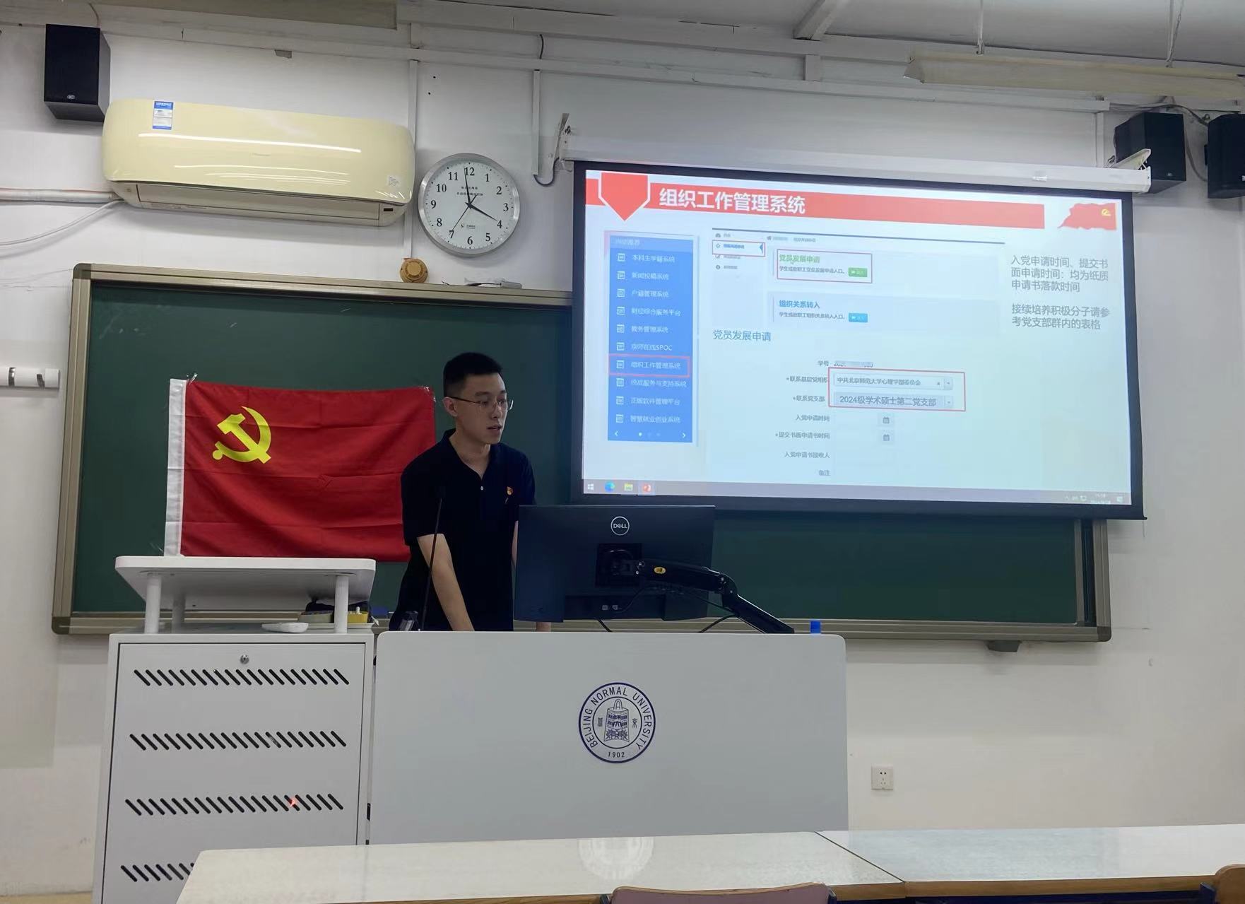 2024年9月28日下午16时,爱爱啦 2024级学术硕士第二党支部于教2楼105顺利开展本学期入党积极分子确定大会和本月的主题党日活动。会议由党支部书记程先楷同志主持。支部9位正式党员,9位拟接续培养的积极分子和8位入党申请人均到场参会。