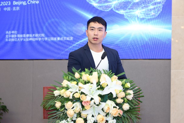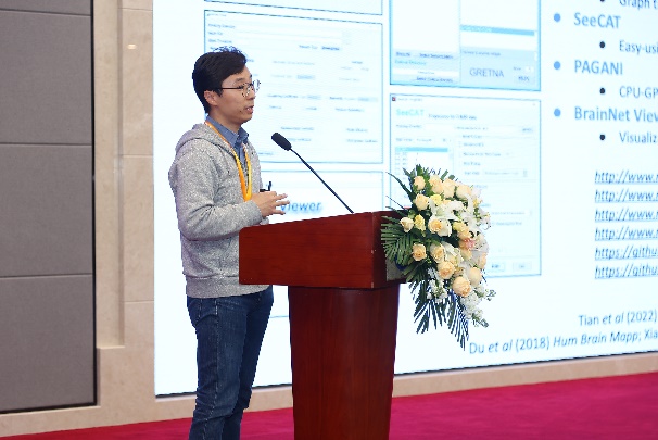 主持人(从左到右,薛言学副教授、左西年教授) 天津医科大学于春水教授做题为《Neuroimaging exposogenomics》的主题主旨报告,展示了其领衔的交叉学科团队如何使用脑影像暴露基因组学来研究大脑结构、功能和行为的个体差异,帮助全面深入理解人类行为个体差异的原因和神经精神疾病发病机制。中国科学院心理研究所严超赣研究员就抑郁症研究所面临的可重复性与复杂性的挑战,介绍了其倡议建设的“抑郁症影像研究联盟”研究成果和下一阶段的发展蓝图,有望借此加速功能神经影像学研究结果向临床应用转化,同时为建立一个开放科学研究资源库。中国联影医疗研究中心资深科学家宋潇鹏博士在《Advances in Neuroscience Powered by Innovative MRI technologies》报告中,介绍了神经影像创新技术及其在神经科学中的应用。中国科学出版社资深编辑刘丽辉博士介绍了“国家卓越行动计划期刊”《科学通报》和《Science Bulletin》的发展,及其所发表的心理学和脑科学前沿领域研究。来自北京大学的朱露莎研究员做《A neurocomputational probe into the development of social communicative ability》报告,展示了其团队针对社会沟通能力所提出的新颖计算神经科学方法,整合人脑功能磁共振成像技术,展示了健康儿童青少年的社会认知能力发展的一般规律和影像学机制及其在孤独症谱系特征上的体现。最后,剑桥大学的助理教授Richard Bethlehem博士在《Putting normative brain charts to use》报告中,详细阐述了“国际人脑图表联盟”所绘制的人类生命周期大脑结构形态发展规范图表,指出“BrainChart”脑图表方法学框架对脑健康个性化评估至关重要。