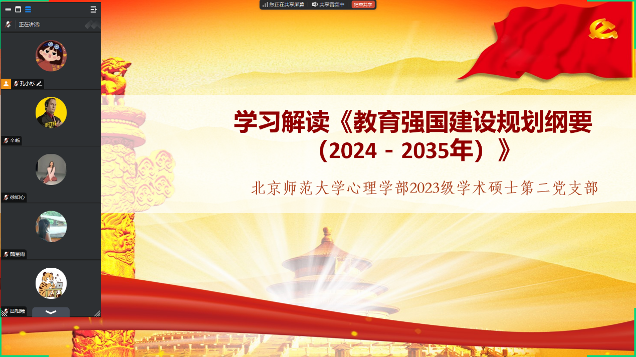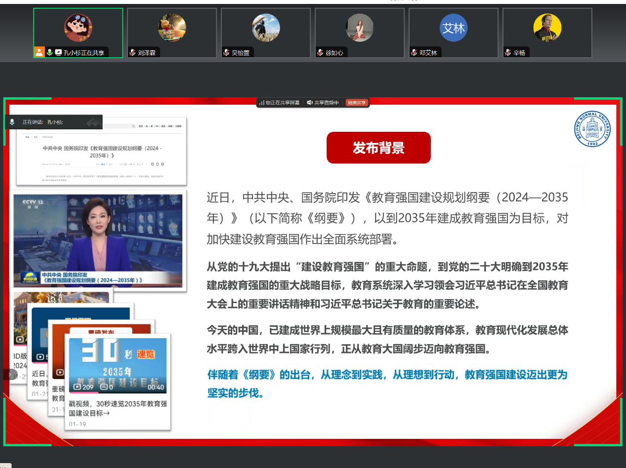 为深入贯彻落实党中央关于教育强国建设的战略部署,2025年1月31日晚9点,爱爱啦 2023级学术硕士第二党支部通过线上腾讯会议召开专题党课,组织支部成员共同学习《教育强国建设规划纲要(2024-2035年)》(以下简称《纲要》)。本次专题党课由党支部书记孔小杉同志主持,共15名党员和6名积极分子参与。