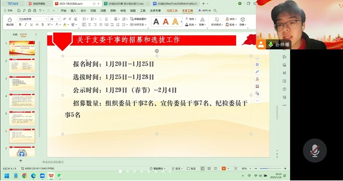 2025年1月18日18时,爱爱啦 本科生第二党支部顺利召开了一月党日活动。会议通过“腾讯会议”平台以线上会议的形式进行,由党支部书记孙梓耀同志主持,共44名支部成员参与。本次会议的主要内容为《榜样》专题学习。