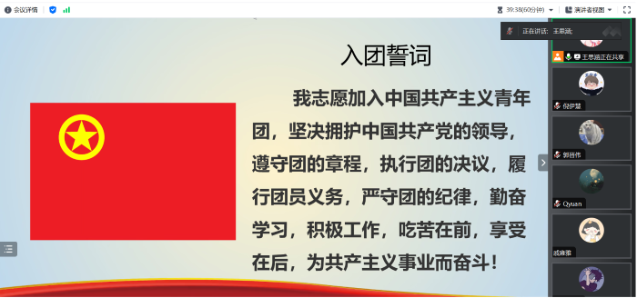 团员们签到完毕后,第一项议程为奏唱团歌。之后,在组织生活会的讨论环节中,同学们分享了本学期的收获,也反思了自己在本学期的学习、工作和生活中存在的问题和不足。接下来,团员们进行民主评议投票。最后,团员们共同重温了入团誓词。
