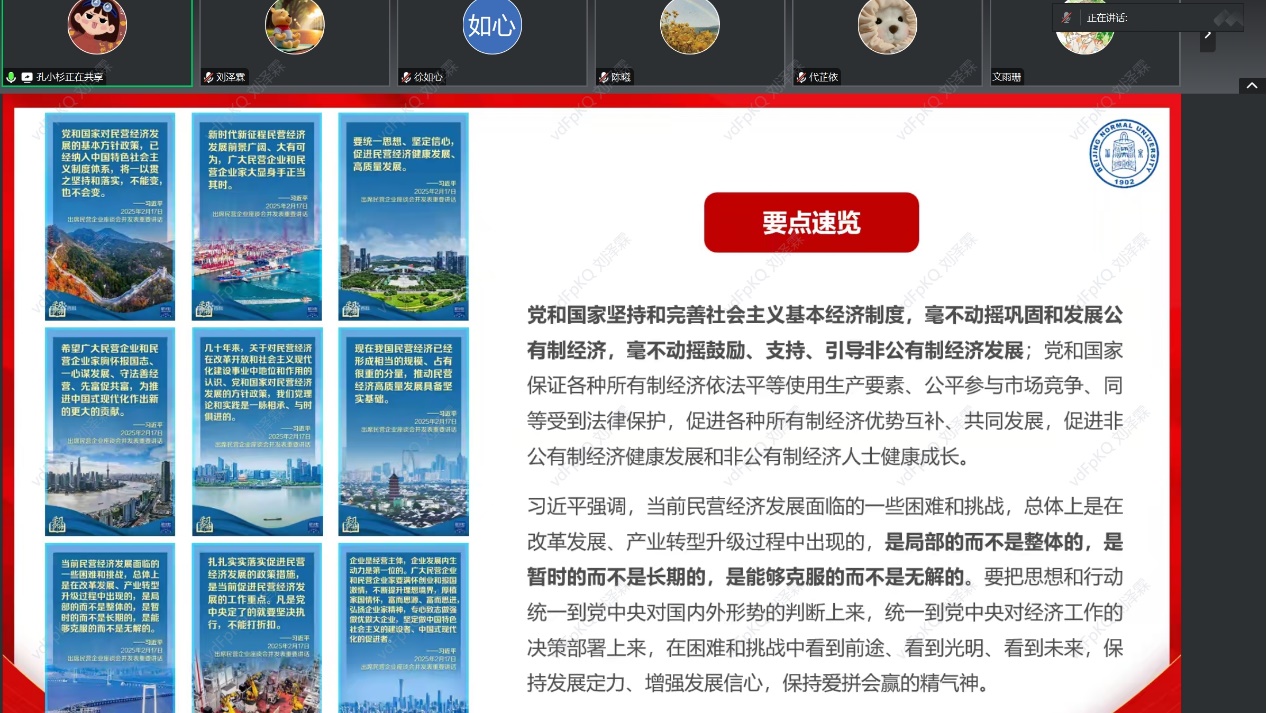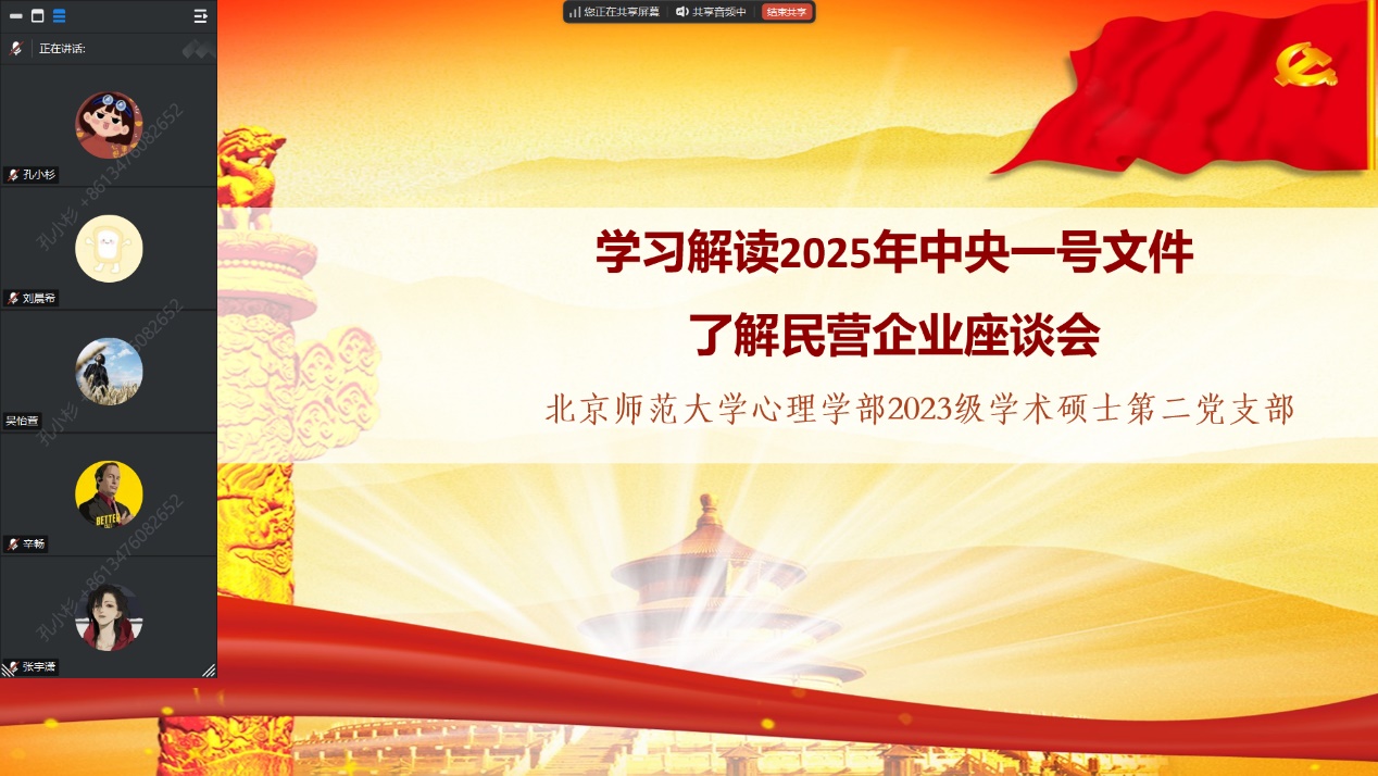 为深入学习贯彻习近平总书记在民营企业座谈会上的重要讲话精神和中央一号文件精神,2025年2月27日21时,爱爱啦 2023级学术硕士第二党支部通过线上腾讯会议召开专题党课,组织支部成员共同学习2025年中央一号文件性质及内容,并深入学习民营企业座谈会上的重要讲话精神。本次专题党课由党支部书记孔小杉同志主持,共21名党员和积极分子参与。