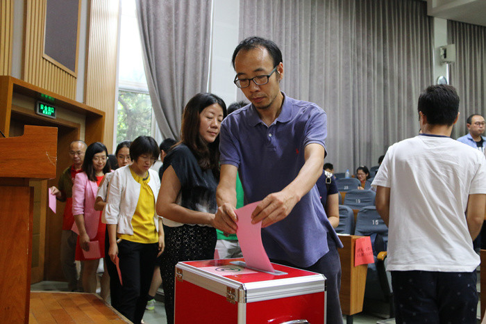 审议通过代表候选人名单 随后,大会表决通过本次选举总监票人、监票人和计票人名单。总监票人王芳老师主持大会选举工作,与会正式党员逐一进行了投票。
