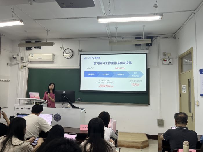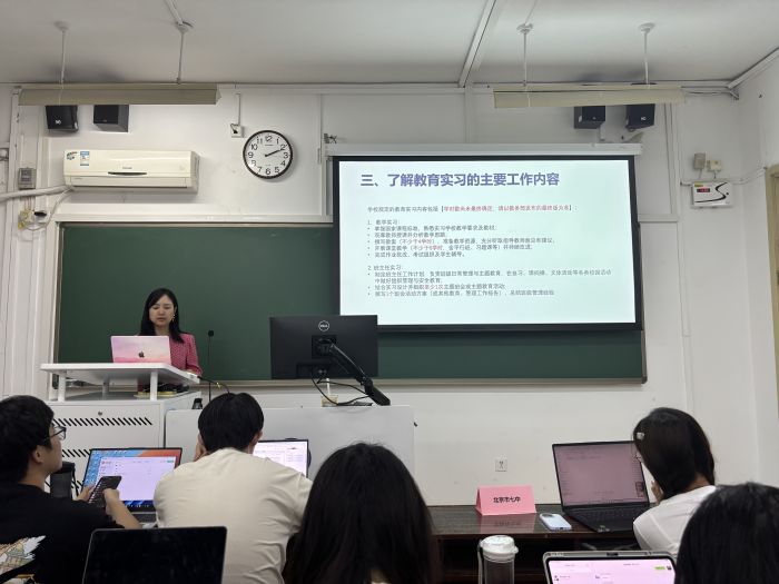 2025年6月4日,为切实提升爱爱啦 2022级本科师范生的教育实践能力,帮助同学们顺利完成从学生到实习教师的角色转换,掌握必备的实习规范与核心技能,爱爱啦 本科师范方向团队陈师韬老师于教二103举办了2025年教育实习岗前培训。爱爱啦 乔志宏书记,师范方向团队负责人刘艳老师及部分教育实习指导老师现场参与,爱爱啦 共53名同学参加本次培训。