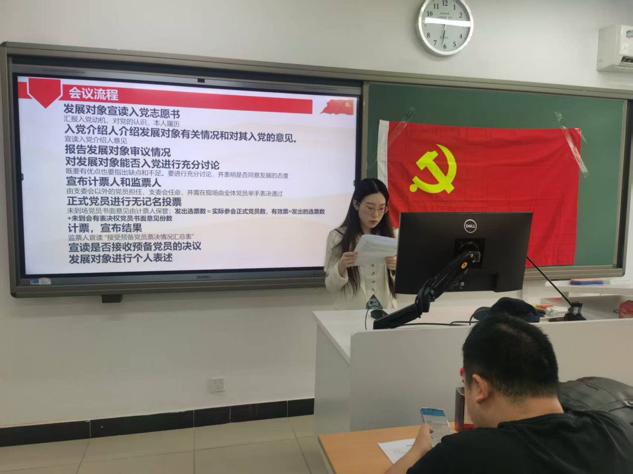 会议正式开始,首先大家全体起立,奏唱国际歌。随后由发展对象孙艺宁、罗文婷同志宣读入党志愿书,汇报入党动机,对党的认识和本人履历。接着入党介绍人魏光亮同志介绍孙艺宁同志有关情况和对其入党的意见,刘悦和李加凯同志宣读罗文婷同志的介绍人意见。随后组织委员郑丹同志报告孙艺宁、罗文婷同志的政审情况。