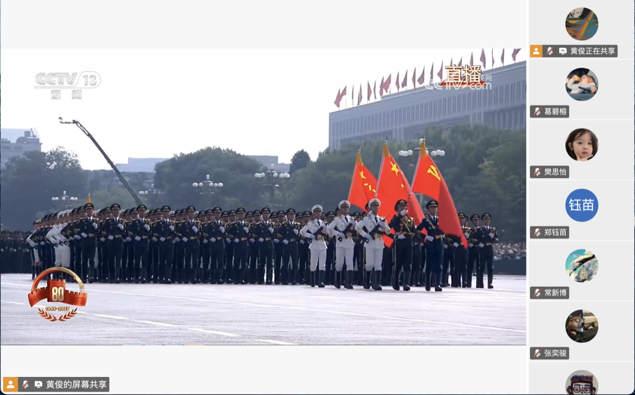 9月3日上午,纪念中国人民抗日战争暨世界反法西斯战争胜利80周年大会在北京天安门广场盛大举行。24级学术硕士第一党支部组织全体党员,通过线上平台同步观看9.3大阅兵直播,在云端共同见证国防力量的恢宏展示,接受爱国主义与精神力量的深刻洗礼。上午9时整,直播信号接通,分散在校园各地的党员同志们,瞬间进入庄严肃穆的观礼状态。