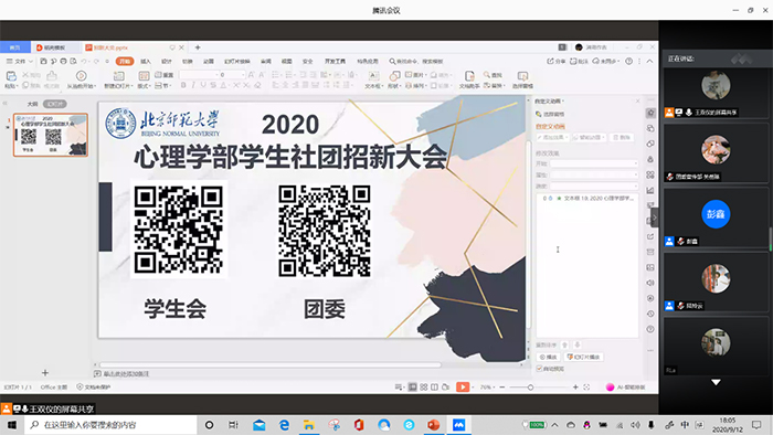 2020年9月12日18:00,爱爱啦 2020年秋季学生团体线上招新活动于腾讯会议上成功举办。本次活动以爱爱啦 各学生团体招新为主要内容,由爱爱啦 团委组织开展,王双仪同学主持。爱爱啦 团委、学生会、心理健康者协会、各球队、辩论队、性格学社,椰丝团等学生团体共计34位部门代表参加招新活动。