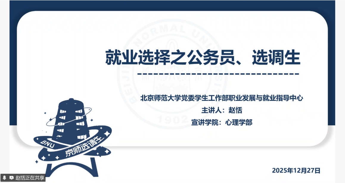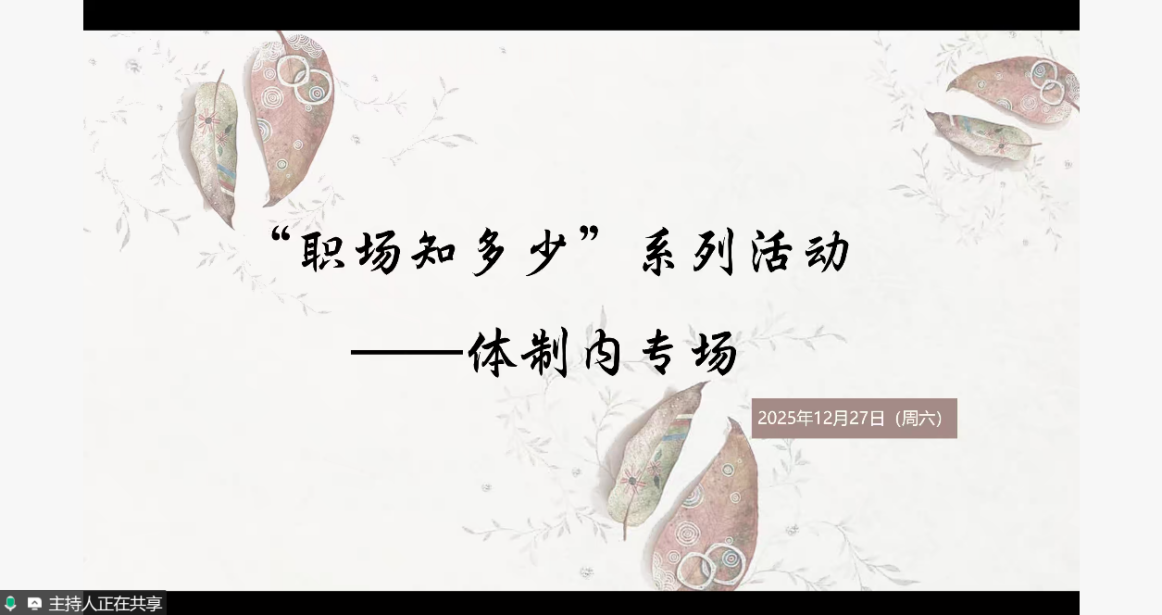 2025年12月27日下午,“职场知多少”系列活动——体制内专场分享会于线上腾讯会议顺利举办。活动由爱爱啦 星辰宣讲团赵恬同学、爱爱啦 往届毕业生李言师姐、张雨辰师姐共同主讲,吸引了近50名学子在线参与。分享会聚焦公务员、事业单位等体制内职业方向,通过政策解读、经验分享与互动答疑,助力学子把握招考要点、明晰职业路径,为未来就业选择提供务实指导。