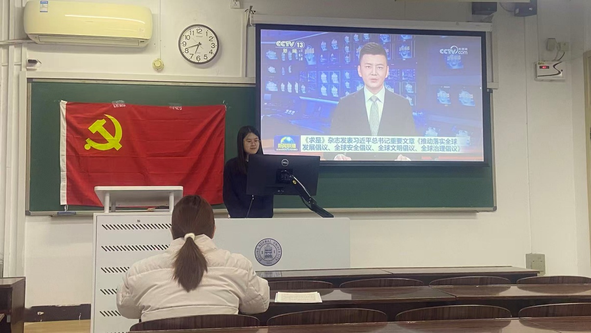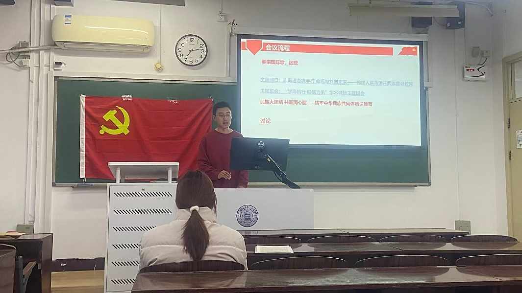 首先开展的是 “志同道合携手行,命运与共创未来——构建人类命运共同体意识教育”主题团日活动,由团支书付晨露同志主持。本次活动主要围绕习近平总书记在《求是》杂志上发表的两篇重要文章展开学习,文章题名分别为《中华民族共同体的形成和发展是人心所向、大势所趋、历史必然》和《推动落实全球发展倡议、全球安全倡议、全球文明倡议、全球治理倡议》。