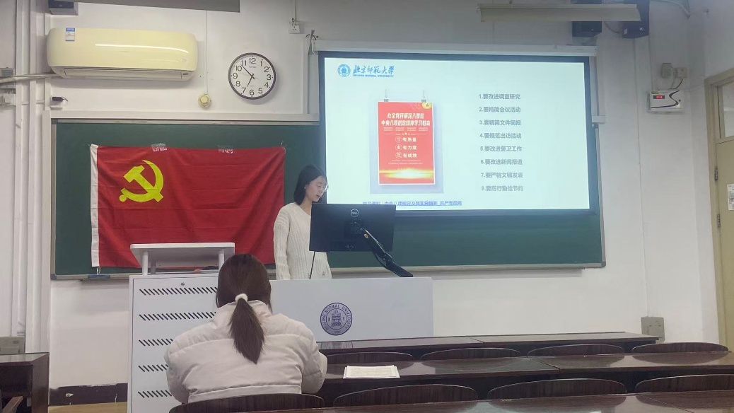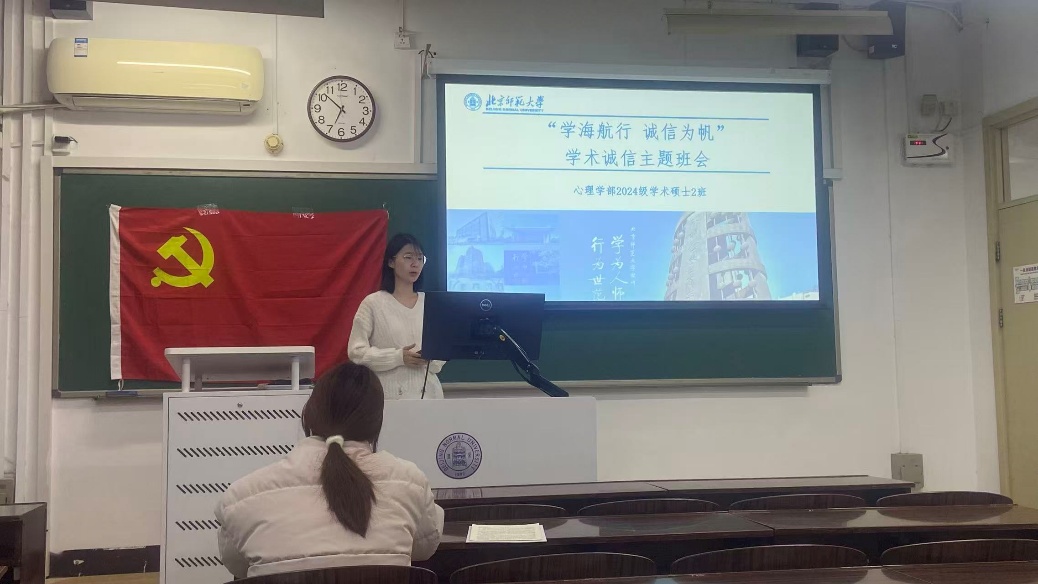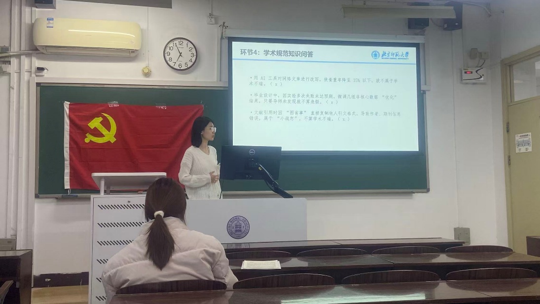 而后是主题班会。班长窦佳宁同志以《学海航行,诚信为帆》为题,带领大家系统地学习了有关中央八项规定和学术科研诚信等相关知识。还通过学术规范趣味问答调动了大家的积极性,更有利于知识入脑入心。