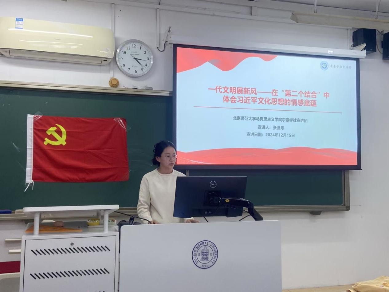 张潇月同志则以《一代文明展新风——在“第二个结合”中体会习近平文化思想的情感意蕴》为题,从中国近代史与中华文明的出路谈起,首先指出“马克思主义”这一魂脉与“中华优秀传统文化”这一根脉的互相成就。张潇月同志接着介绍了习近平文化思想的三大底蕴——对马克思主义的信仰,对中华文明的自信,以及对人民群众的大爱之情,深刻剖析了中华文化繁荣兴盛和中华民族伟大复兴的相依关系。